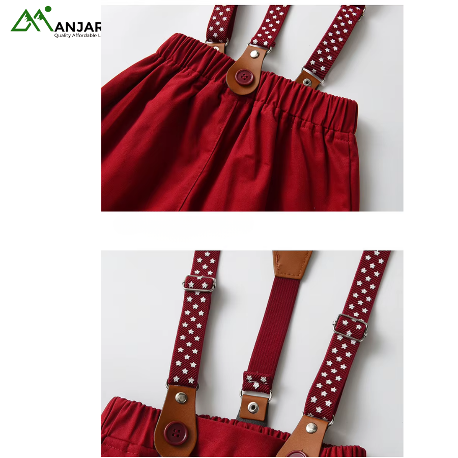Crafted from a soft cotton-polyester blend, this set is comfortable, breathable, and perfect for spring or autumn occasions. The lapel collar and button details add a sophisticated touch, while the suspenders ensure a secure, adjustable fit. Ideal for birthdays, weddings, family gatherings, or formal events, this ensemble combines practicality, comfort, and timeless style for young boys.