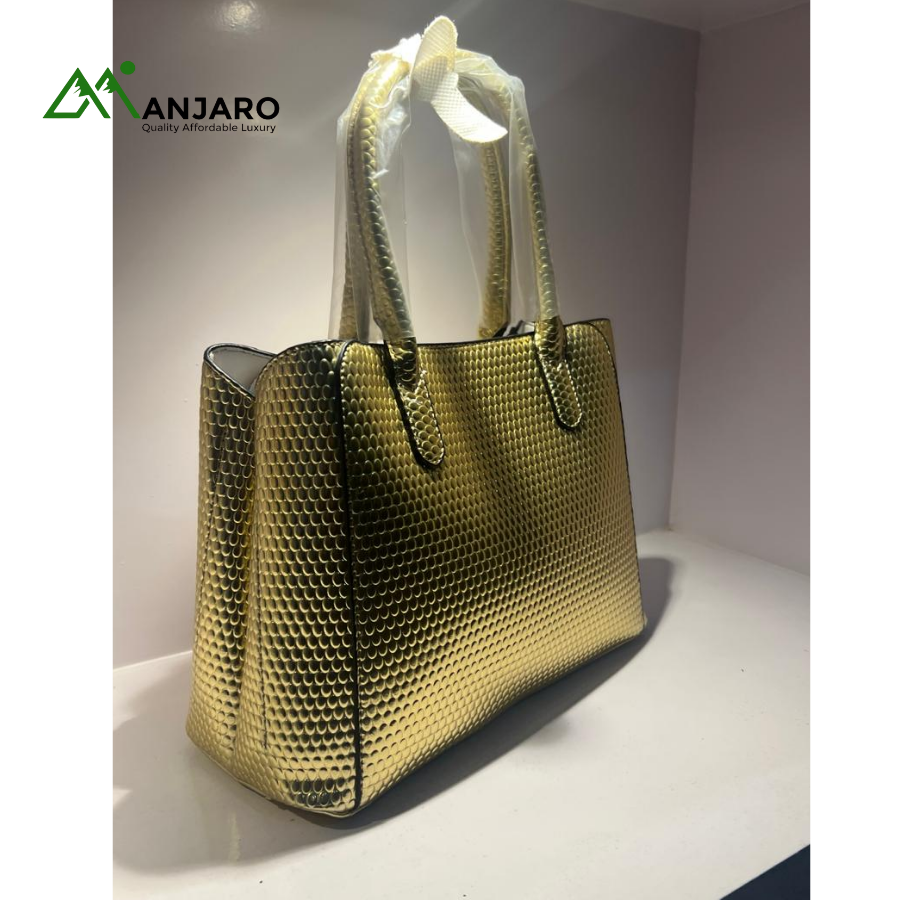 Make a statement with the Gold Textured Top Handle Handbag (Guess-Style), the ultimate accessory for those who value elegance and style. Featuring a luxurious textured gold finish, this handbag instantly elevates any outfit, from casual outings to evening events. The structured silhouette with a top handle ensures a sophisticated carry, while a detachable shoulder strap allows versatile styling as a crossbody bag. Inside, the thoughtfully designed compartments keep your essentials—phone, wallet, keys, and cosmetics—organized and easily accessible. Lightweight yet durable, this handbag blends practicality with glamour, giving you a bold accessory that’s perfect for fashion-forward individuals.