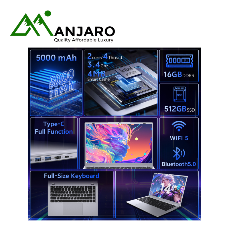 Enjoy crystal-clear visuals on a 14-inch Full HD IPS display (1920×1080) with a 16:9 aspect ratio, perfect for presentations, streaming, or work on the go. With 16GB DDR4 RAM and a 512GB SSD, it offers ample memory and fast storage — expandable up to 64GB RAM and 1TB SSD for enhanced performance.