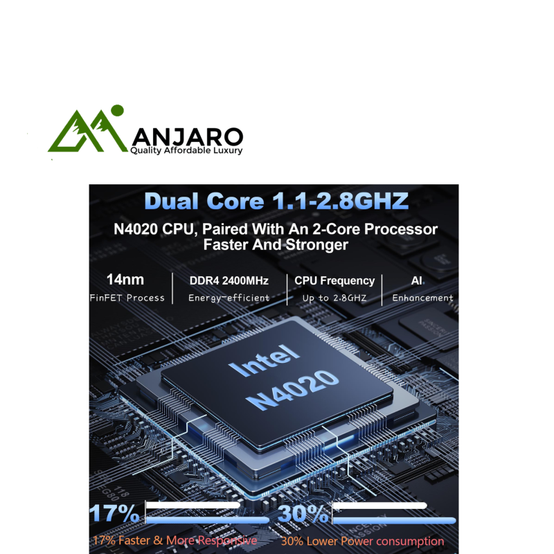 Powered by the Intel N4020 Dual-Core processor with integrated graphics, it ensures smooth multitasking whether you're streaming, browsing, or working on documents. The SSD storage option offers fast boot-up speeds and ample space for apps and files, while the WiFi 802.11 b/g/n + Bluetooth 4.2 provides stable wireless connectivity.