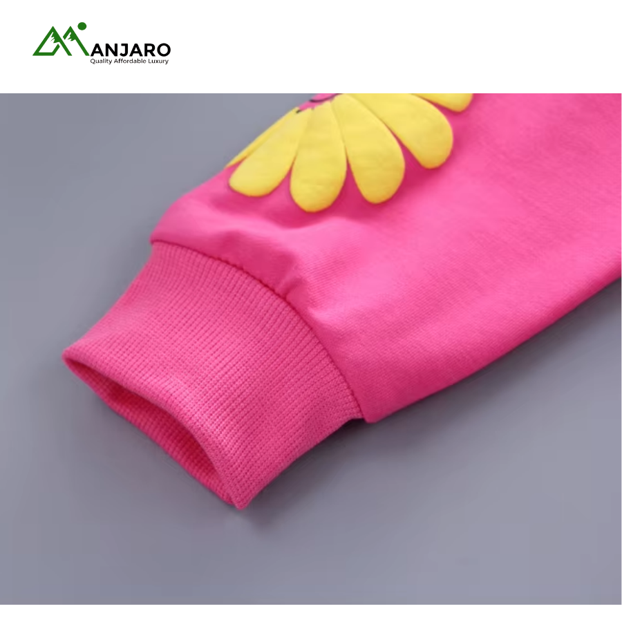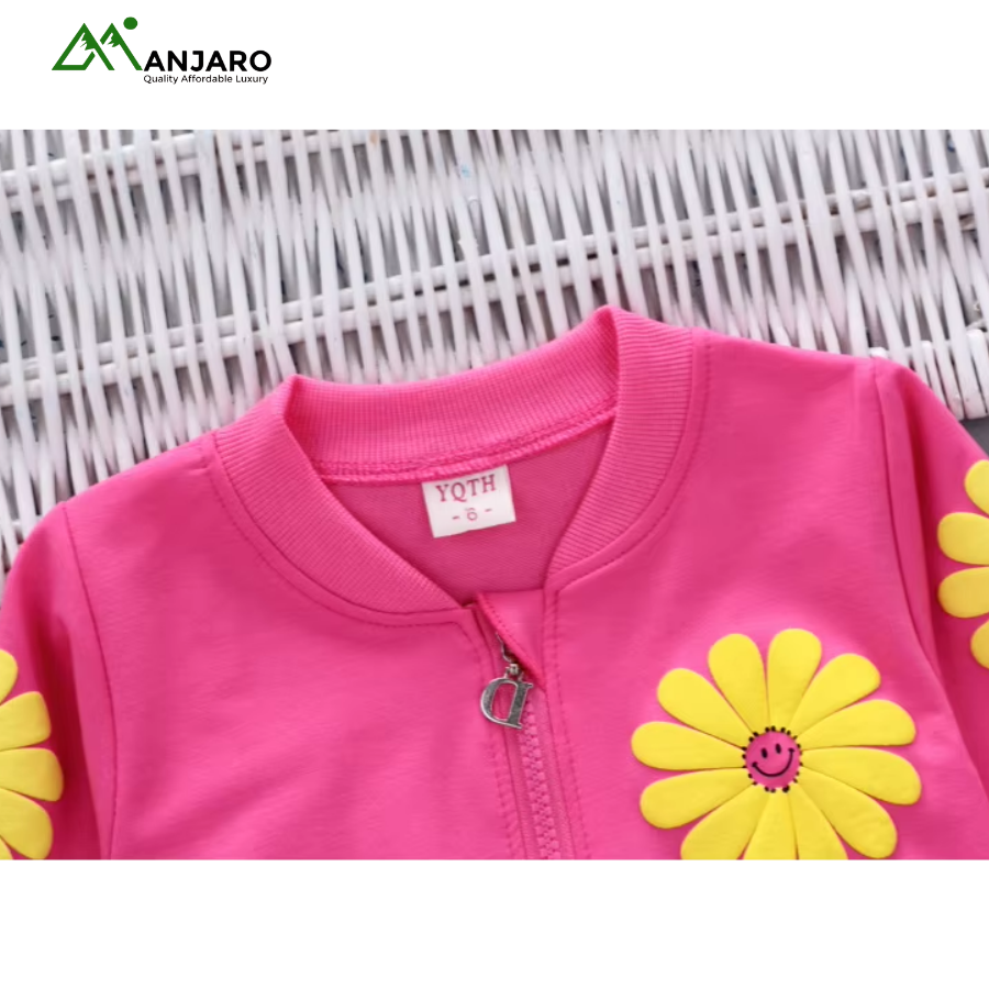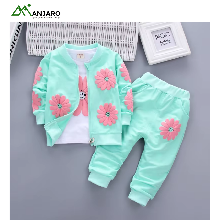 Featuring a floral pattern, the set includes a cozy jacket, matching T-shirt, and comfy pants, making it easy to mix, match, and layer. Ideal for casual wear, family gatherings, or festive occasions, this set combines practicality with adorable design, keeping your child stylish and comfortable in every season.
