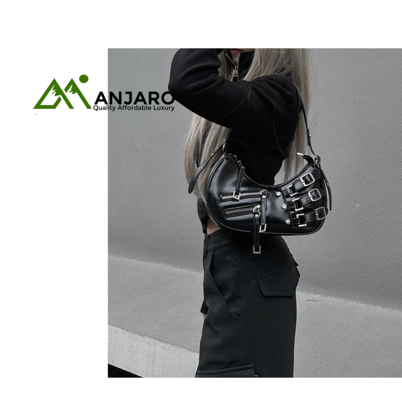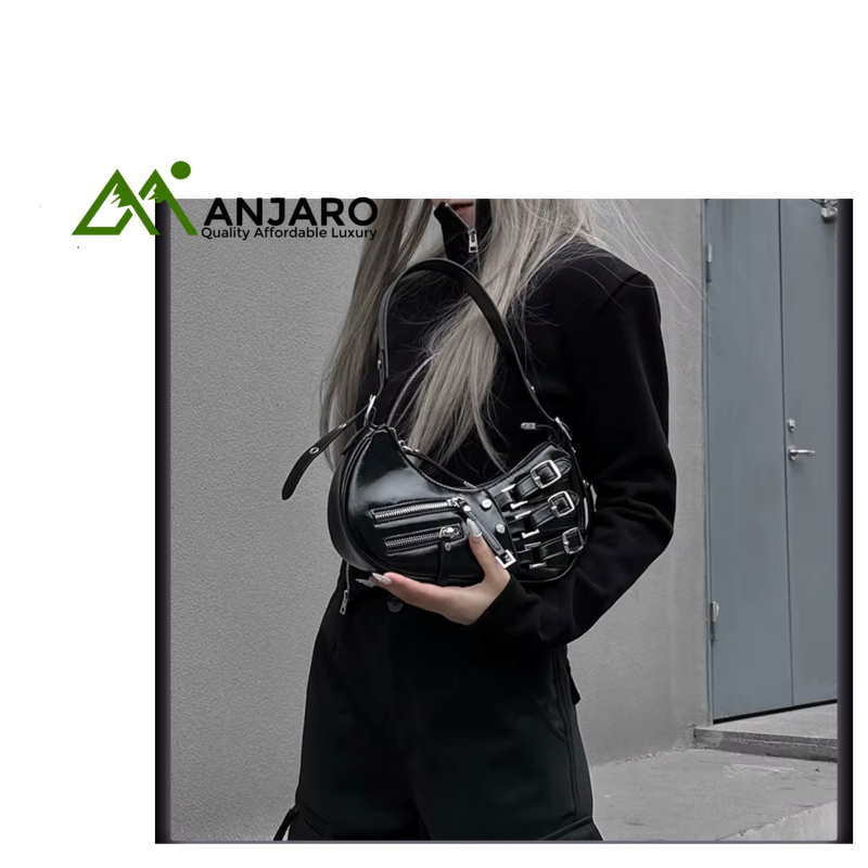 Add an edgy yet refined touch to your outfit with the Black Bright Face Niche Design Shoulder Retro Spice Motorcycle Bag. This underarm bag takes cues from American motorcycle style with its glossy PU finish, chain and button detailing, and bold silhouette.