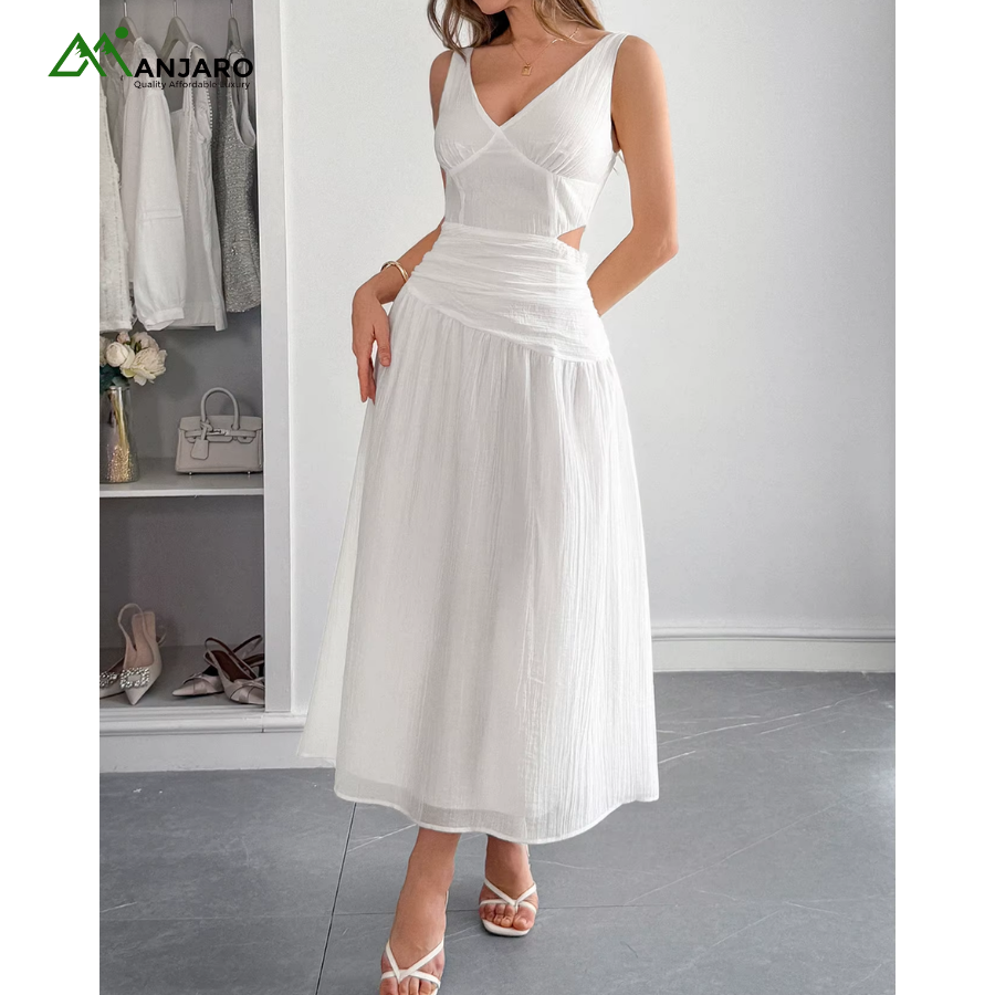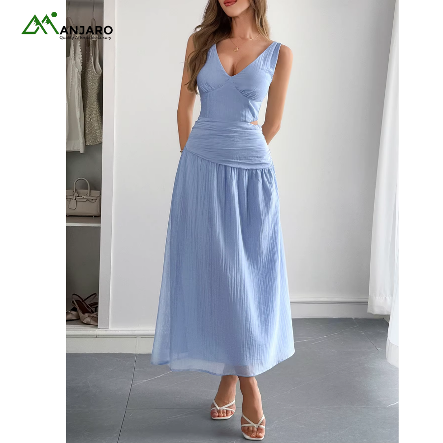 The V-neckline and sleeveless silhouette bring a light, airy feel, while the hollow-out cut-out detailing adds a subtle touch of allure. Its loose, flowy fit ensures maximum comfort and movement, flattering every figure with ease. The knitted fabric and natural waistline create a relaxed yet refined aesthetic, making this maxi dress an essential wardrobe staple for the modern woman.