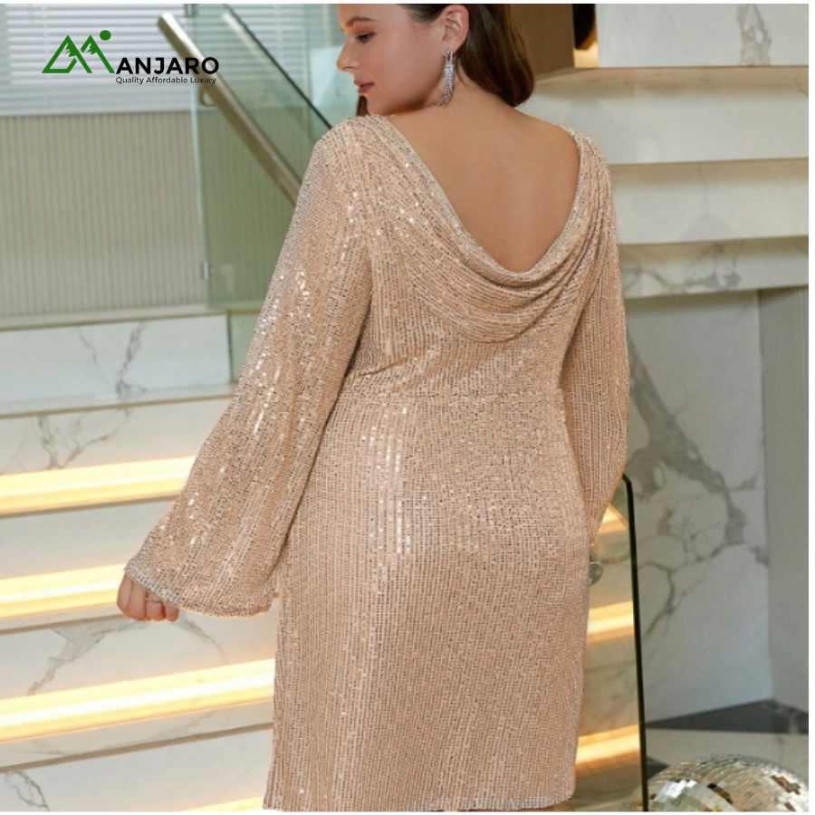 Shine at every special occasion with the D&M Plus-Size Sequin Long Sleeve Bodycon Dress, designed for elegance, comfort, and glamour. This knee-length formal dress features a wrap-style silhouette, full sleeves, and a flattering bodycon fit that enhances curves while allowing comfortable movement.