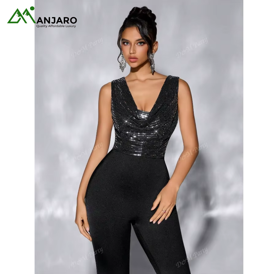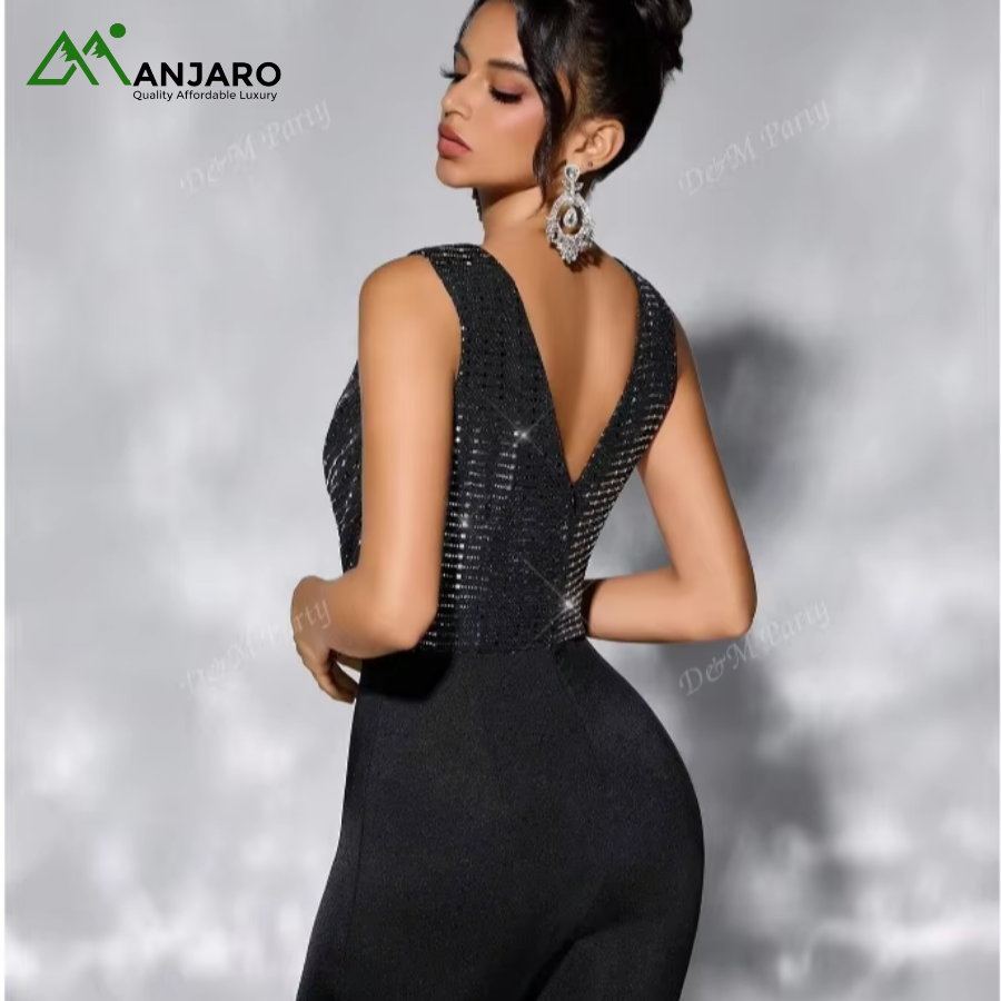 Step into elegance with the D&M Women's Black V-Neck Sleeveless Jumpsuit, designed for unforgettable formal occasions and evening events. Crafted from 100% polyester, this full-length jumpsuit combines a flattering high waist silhouette with sparkling sequined decoration, offering a look that’s both sophisticated and striking. Perfect for parties, cocktail evenings, or any formal event, this jumpsuit ensures style, comfort, and confidence in every move. Its waterproof design and all-season wearability make it a versatile addition to your wardrobe, while the regular fit enhances ease of movement without compromising elegance.