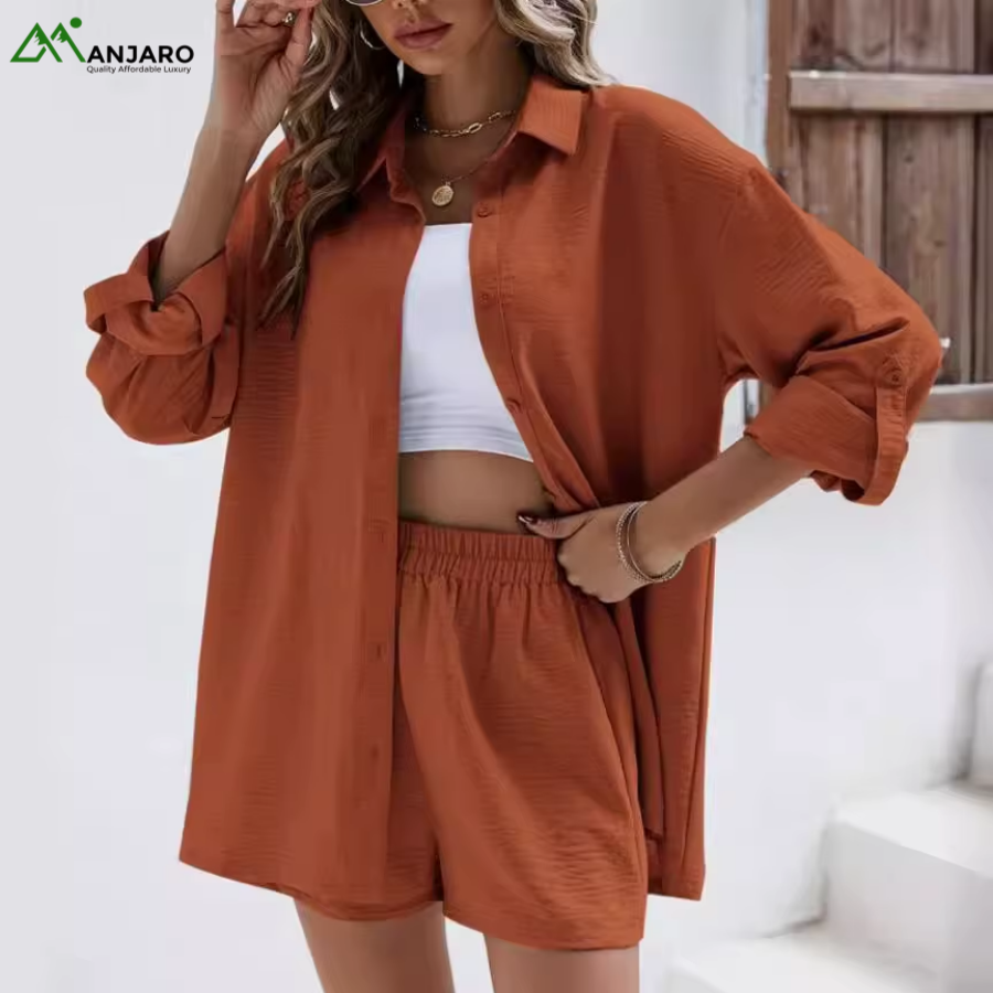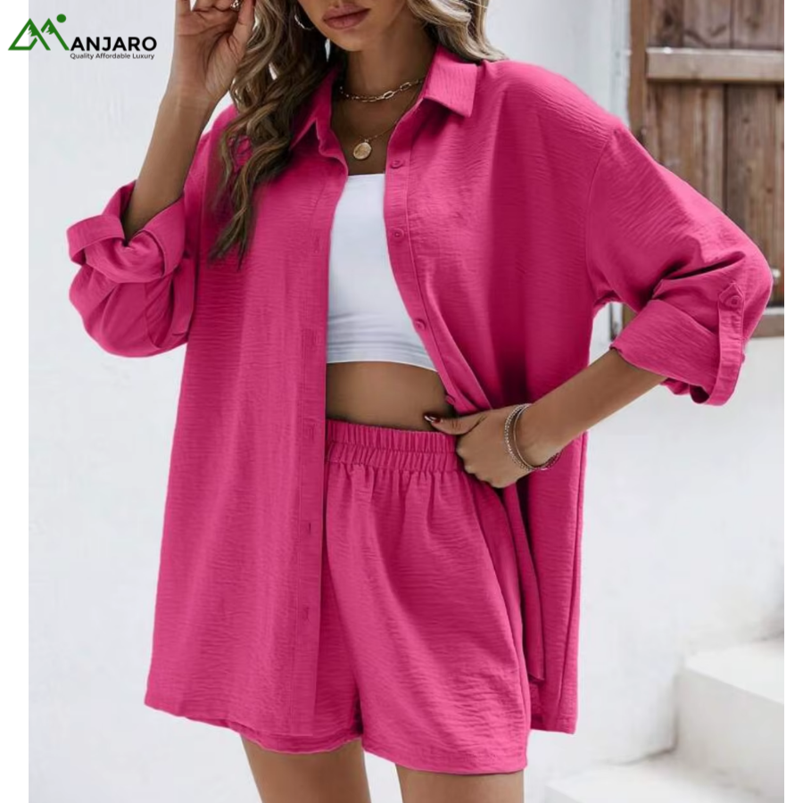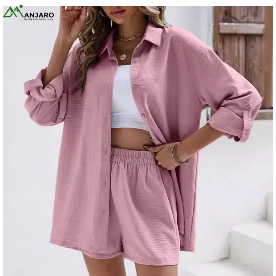 Stay effortlessly stylish with the D&M Women’s Fashion Casual Suit Set, designed for women who love comfort and elegance in one look. This 2-piece shorts set features a collarless long-sleeve shirt paired with elastic high-waist shorts, giving a relaxed yet polished fit.