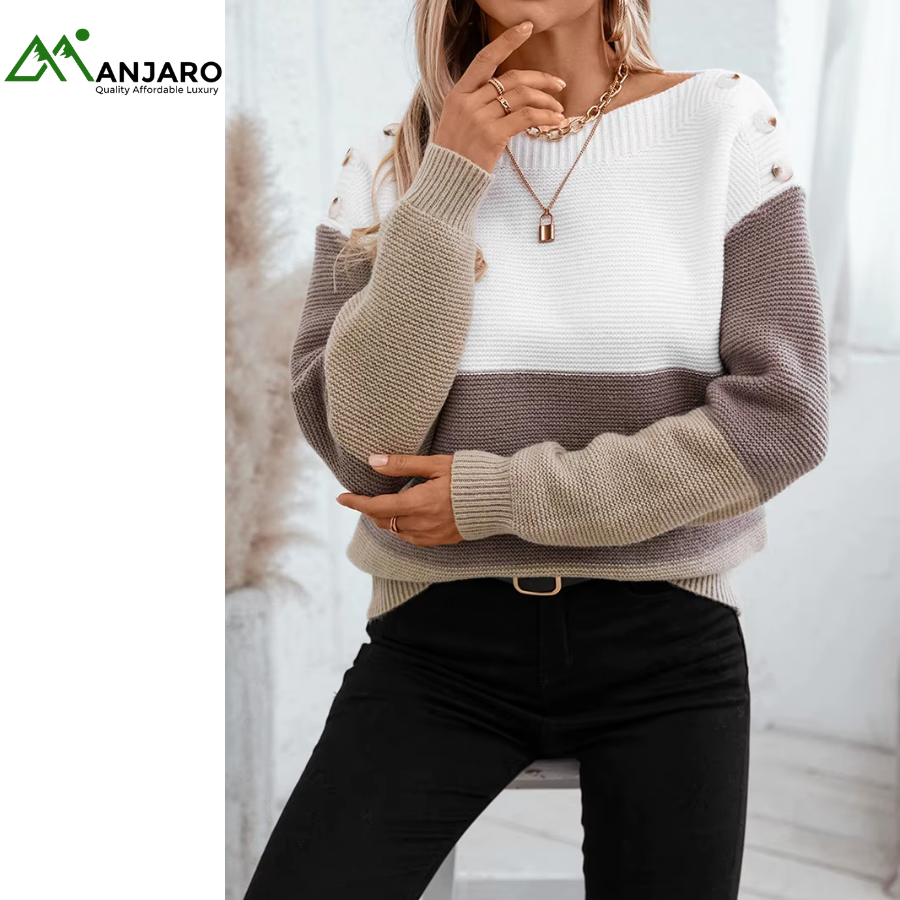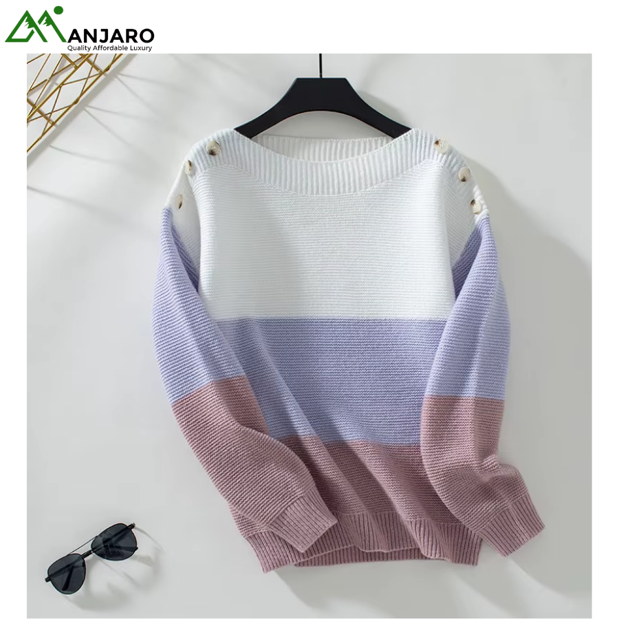 Designed with a drop shoulder, O-neck, and long loose fit, it offers effortless style while ensuring freedom of movement. The contrast stripes and tie belt detail at the back add a modern touch to this classic knitted design, making it versatile for pairing with jeans, skirts, or trousers.