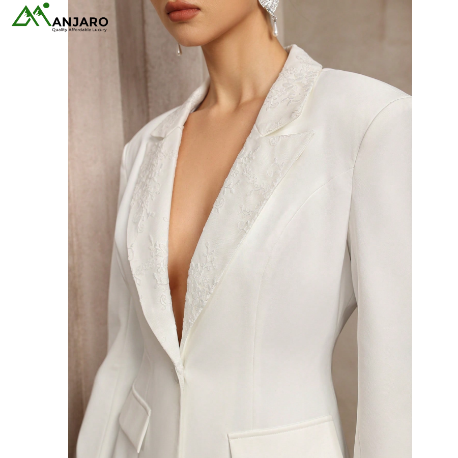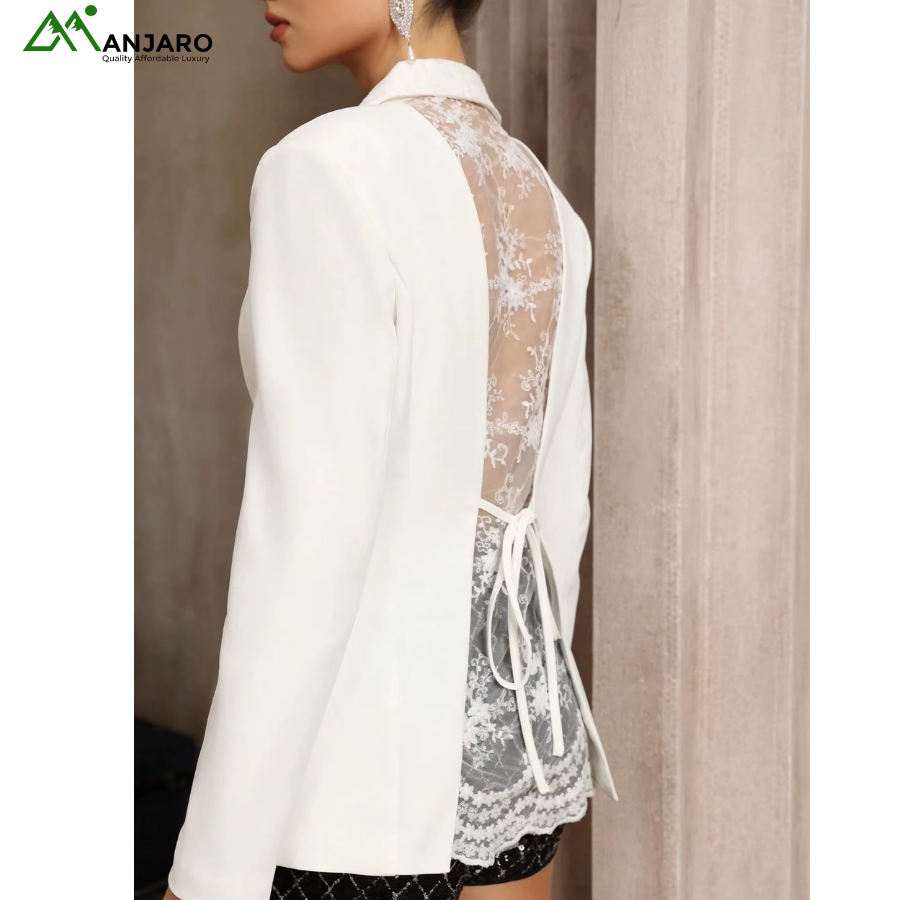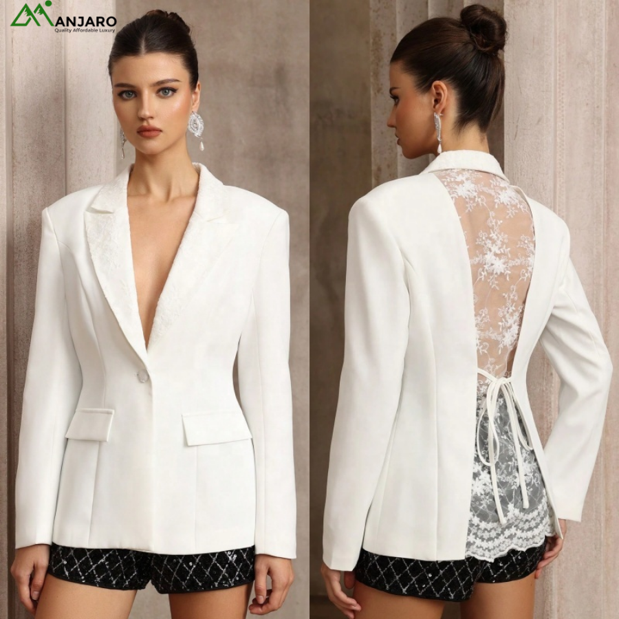 Featuring a single-button front closure, square collar, and subtle lace decoration, it merges classic tailoring with feminine sophistication. The worsted fabric texture provides structure and comfort, while nail bead embroidery detailing adds a refined finish.
