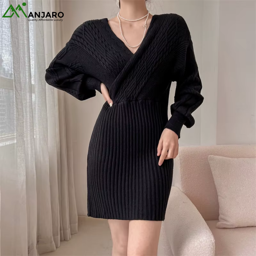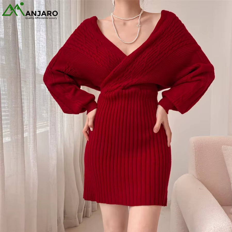 Featuring a sexy V-neck cross collar, open shoulder design, and hip underlay, it balances elegance with relaxed comfort. The thick computer-knitted fabric provides a structured yet flexible fit, while anti-shrink, anti-wrinkle, and breathable properties ensure it maintains its shape and comfort season after season.