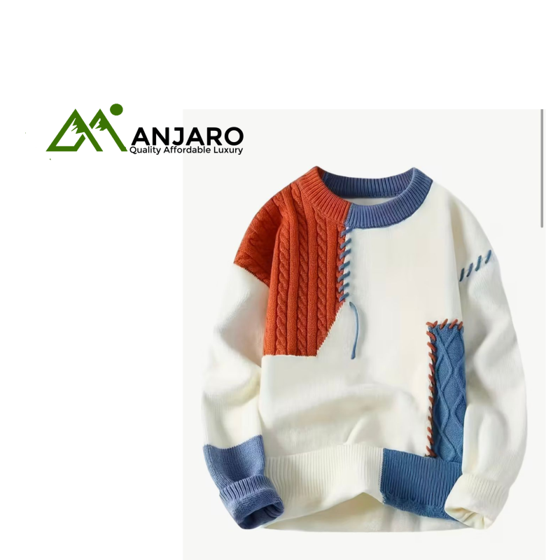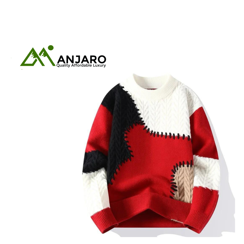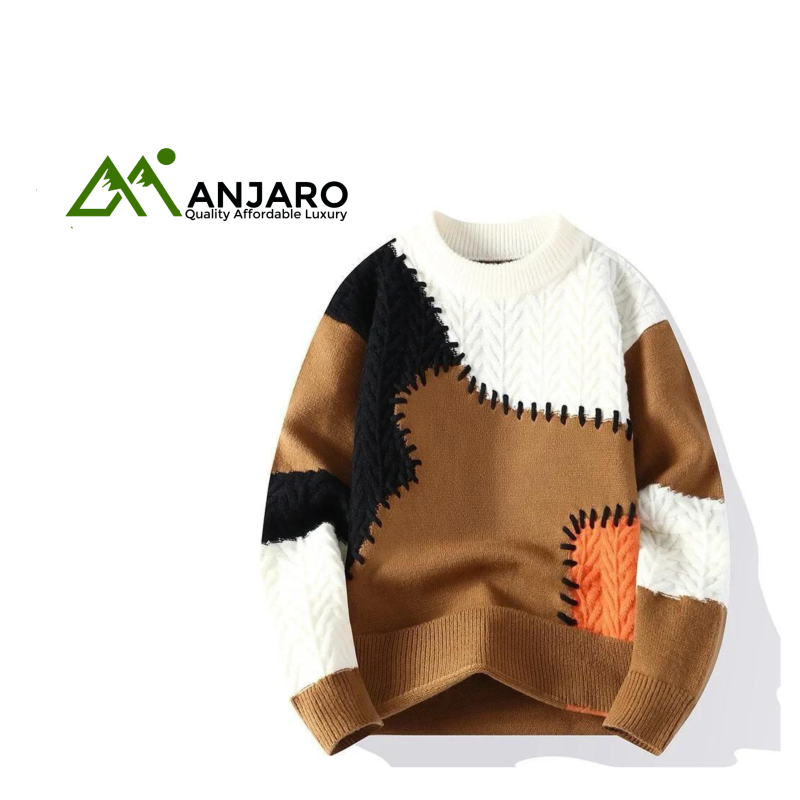 Avant-Garde Design: Features a unique color-block and patchwork construction with contrasting knit patterns (cable and smooth) and decorative exposed stitching for a high-fashion, artistic look.
