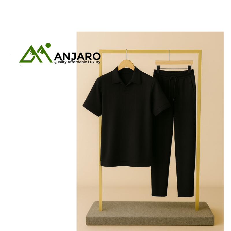 Upgrade your casual wardrobe with this Men’s Black Set, featuring a stylish polo shirt and matching jogger pants designed for comfort and versatility. The polo shirt boasts a sleek fit with subtle detailing, while the jogger pants provide an elastic waistband, drawstring, and side pocket for practical, everyday wear. Perfect for lounging, running errands, or casual outings, this set combines modern style with all-day comfort. Elevate your casual look effortlessly with this coordinated set that balances fashion and function.