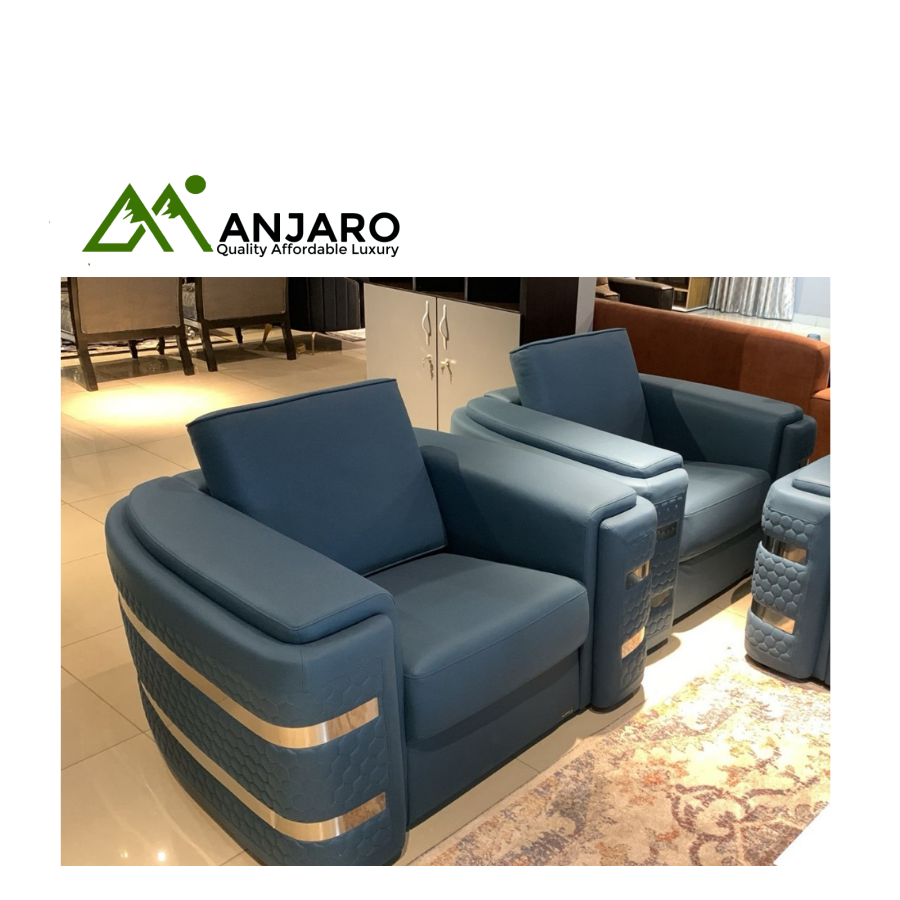Anchor your living room or executive reception area with the bold, contemporary style of the Ocean Elite Sofa Set. This dynamic 4-piece collection is upholstered in premium, easy-to-clean vibrant blue leatherette, offering a rich color that makes an immediate statement. The design is elevated by distinctive metallic silver/chrome trim that curves elegantly around the base and arms, complemented by refined diamond-patterned stitching on the side panels. The set provides generous, deep seating with wide, padded armrests for ultimate comfort. The Ocean Elite set is a must-have for the forward-thinking host or professional, blending luxurious comfort with an undeniably modern, empowered aesthetic, making it the perfect foundation for community and connection.