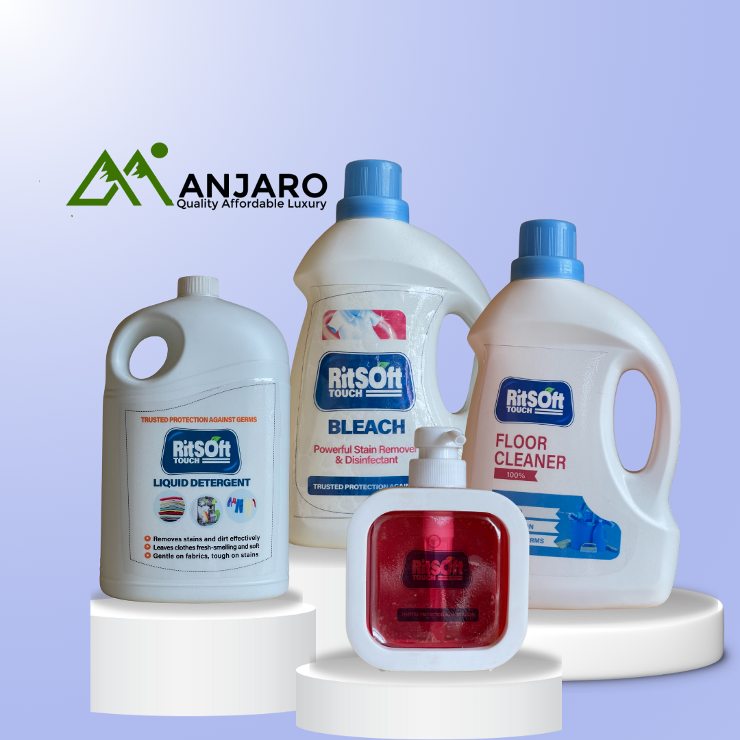 Complete Cleaning Kit – Includes bleach (2L), floor cleaner (2L), hand soap (0.5L), and liquid detergent (2L)