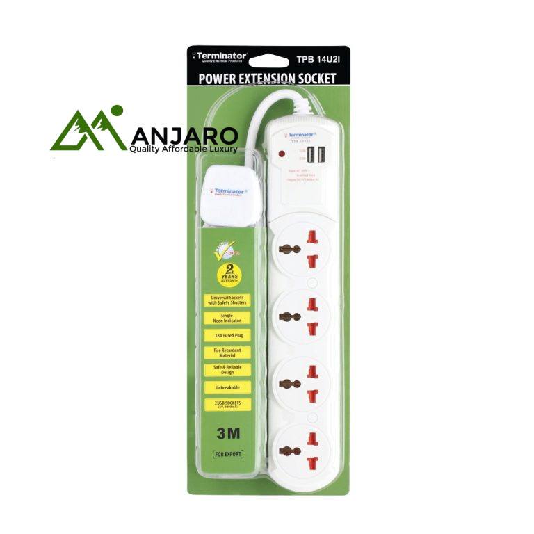 Power up with confidence using the Terminator 4 Way Universal Extension Socket with 2 USB charging ports. Designed for both home and office use, this high-quality extension allows you to safely power multiple devices at once, including smartphones, laptops and other appliances. With universal outlets, it supports a wide range of plug types, making it ideal for international users.