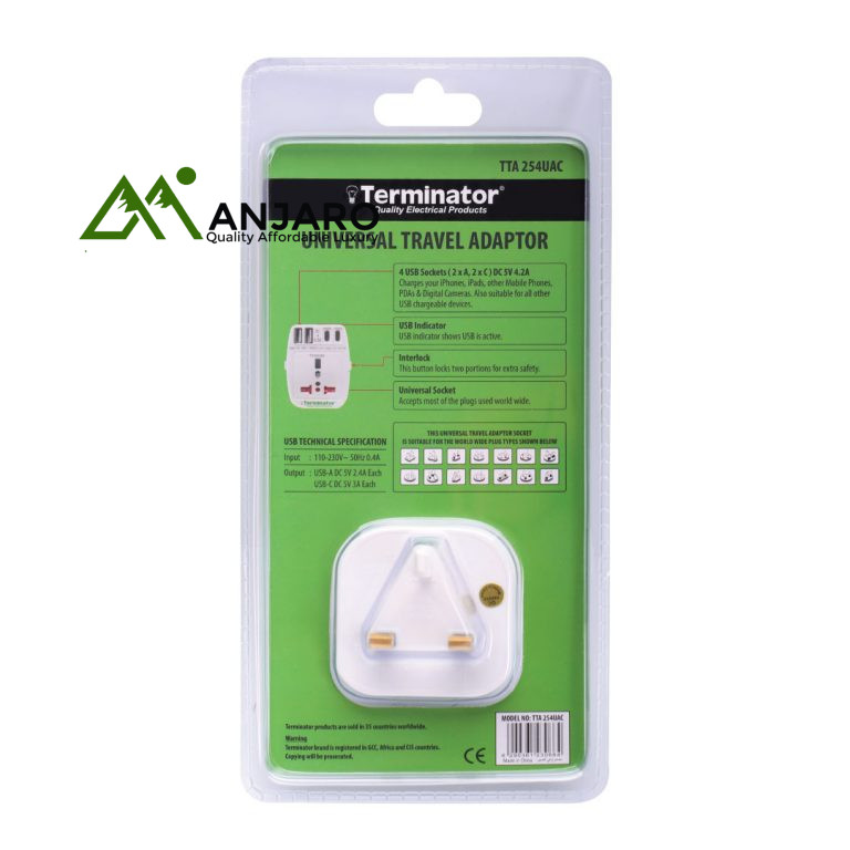 Stay powered anywhere in the world with the Terminator TTA 254UAC Multipin Universal Travel Adaptor – your ultimate travel companion for charging multiple devices on the go. Equipped with 4 USB ports (2 x USB-A and 2 x USB-C) with a combined output of 4200mA, this compact adaptor ensures your gadgets stay charged whether you're at the airport, in a hotel or abroad.