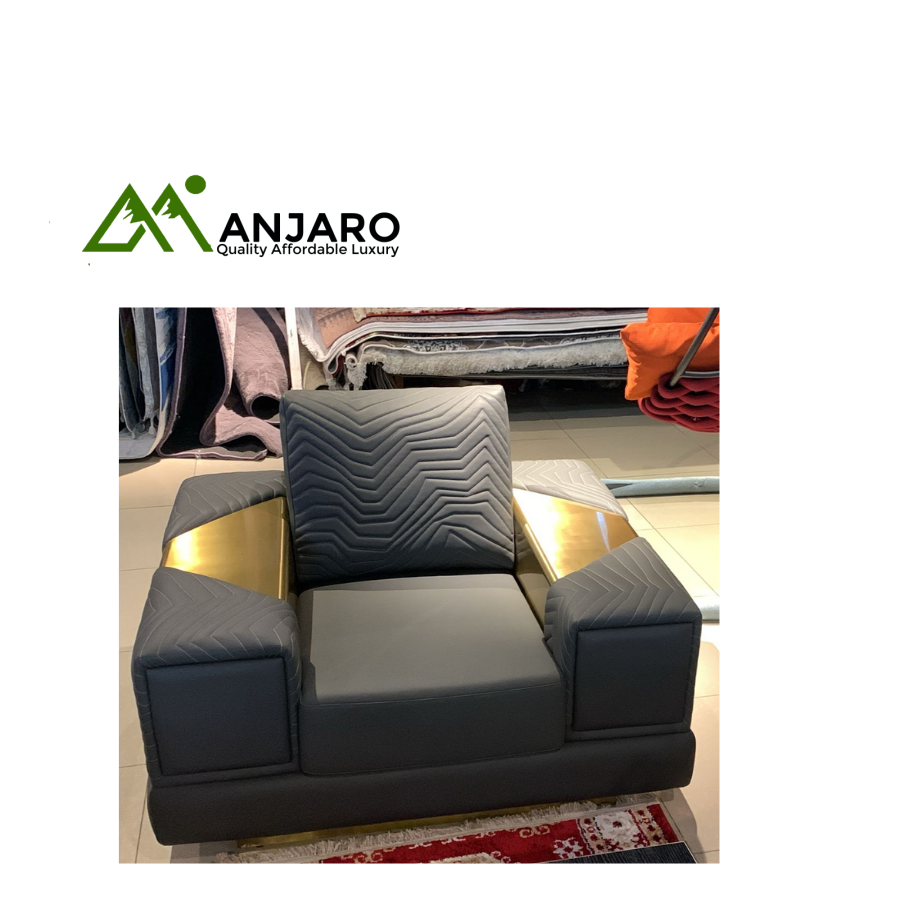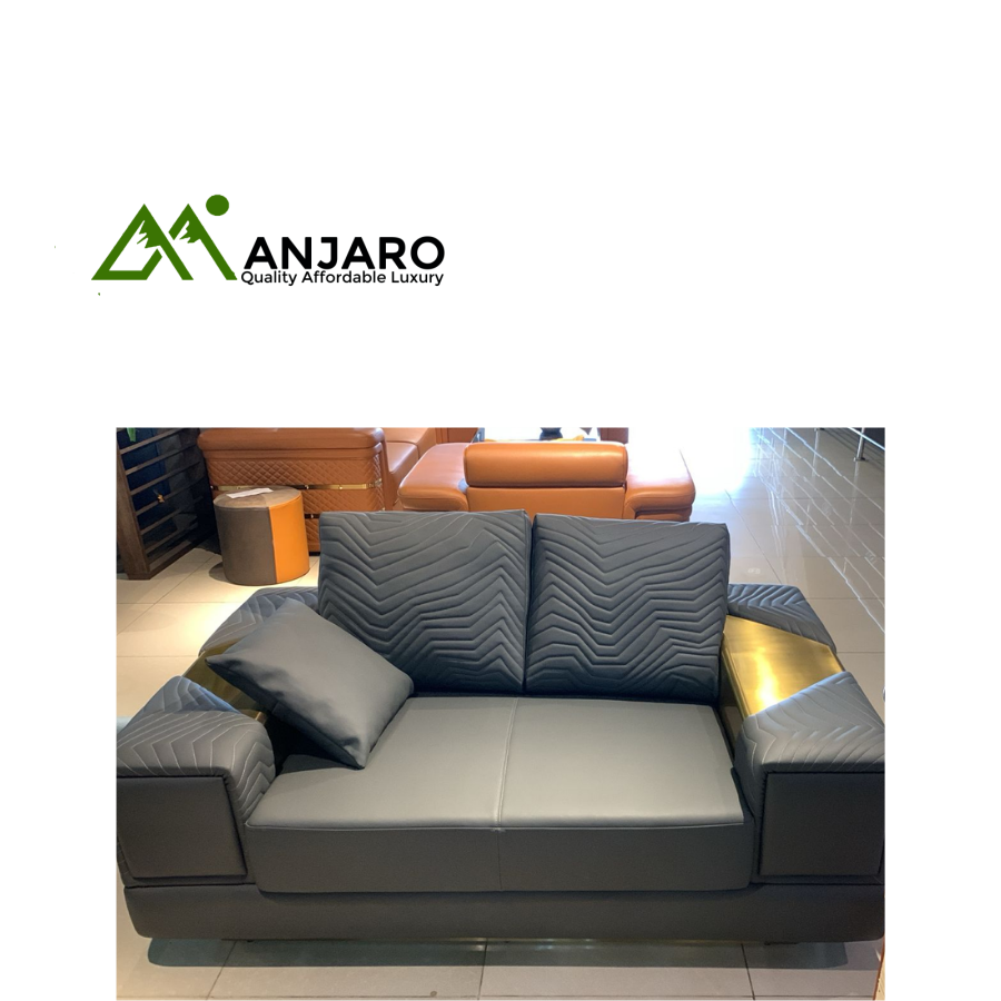 Make a powerful statement with the Velocity Edge Sectional Sofa Set. This sleek, dynamic collection is designed for the modern, forward-thinking home or executive office, blending high-end design with uncompromising comfort. The set is upholstered in a premium, durable dark grey leatherette, featuring a distinctive angular stitch pattern on the back and arm cushions for a refined, modern texture. Its most striking features are the bold gold metallic side panels integrated into the arms and the gold trim at the base, creating a luxurious, empowered aesthetic. The sectional configuration provides generous seating, while the wide armrests offer functional space. The Velocity Edge set is a must-have for building a community space that inspires connection and elevated style.