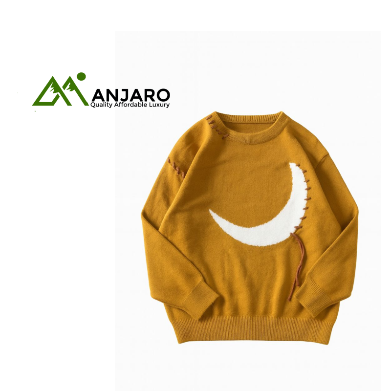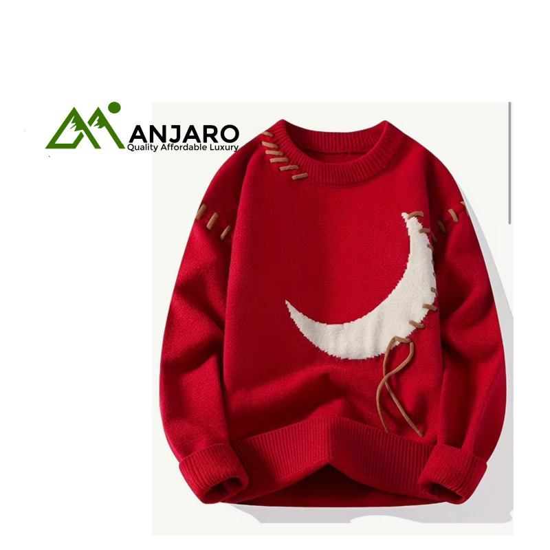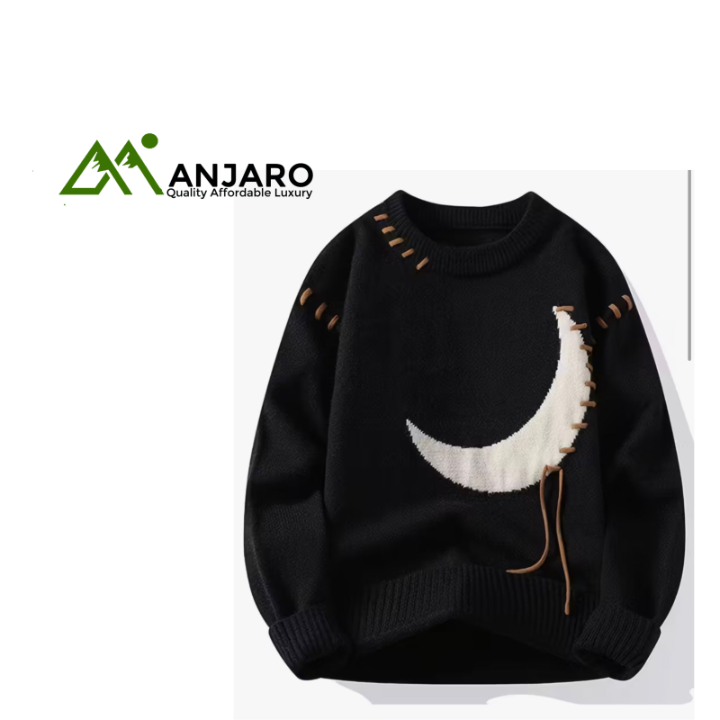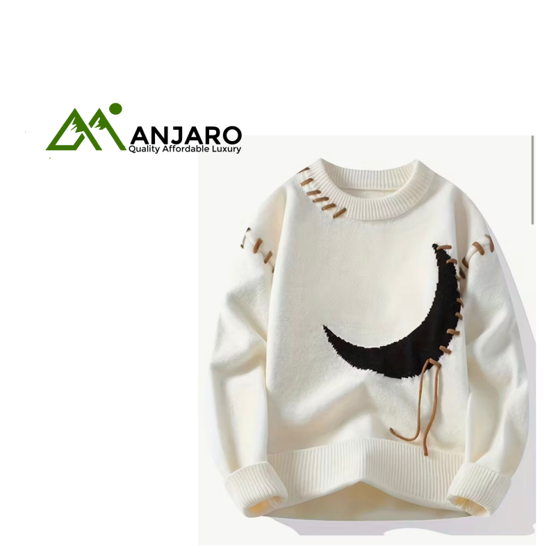 Embrace a new phase of style with the Crescent Moon Stitched Sweater. This piece redefines minimalist design with its powerful, artistic details. Set against a clean, off-white canvas, a bold black crescent moon appliqué takes center stage, attached with distinctive, rustic brown lacing that extends to the shoulders and neckline. This deconstructed stitching technique transforms a classic silhouette into a wearable work of modern art, perfect for those who find beauty in the details.
