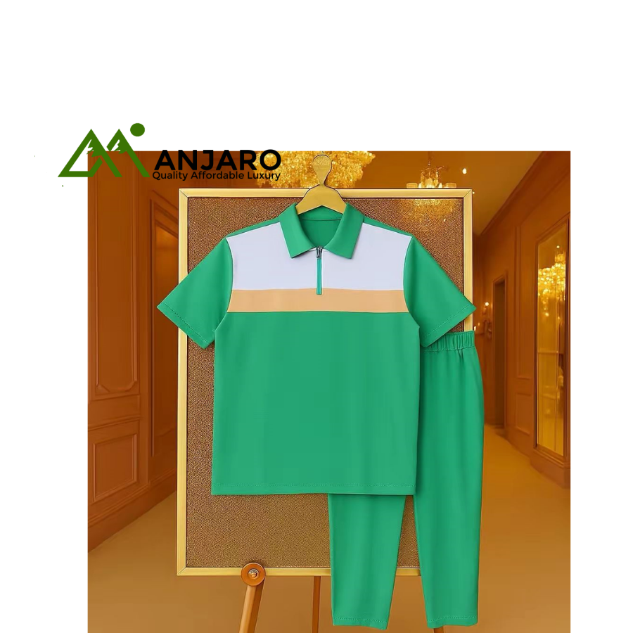Stay sporty and stylish with this Green & White Colorblock Two-Piece Tracksuit, designed for men who want to combine comfort with bold fashion. Featuring a short sleeve top with a modern zip collar and coordinated jogger pants, this set is perfect for casual outings, workouts, and athleisure styling.