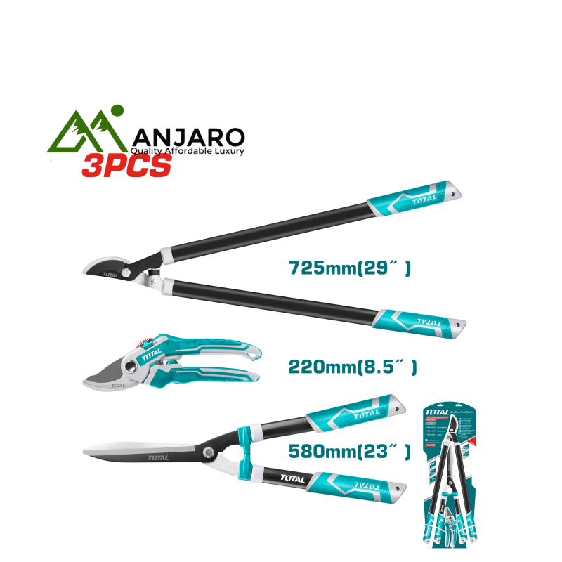 Tackle all your trimming and shaping needs with the Total THT1576033 3 Pcs Garden Shears Set, designed for efficient and precise garden maintenance. This all-in-one set includes hedge shears, grass shears, and pruning shears, each crafted with durable, sharp blades and ergonomic handles for comfort during extended use.