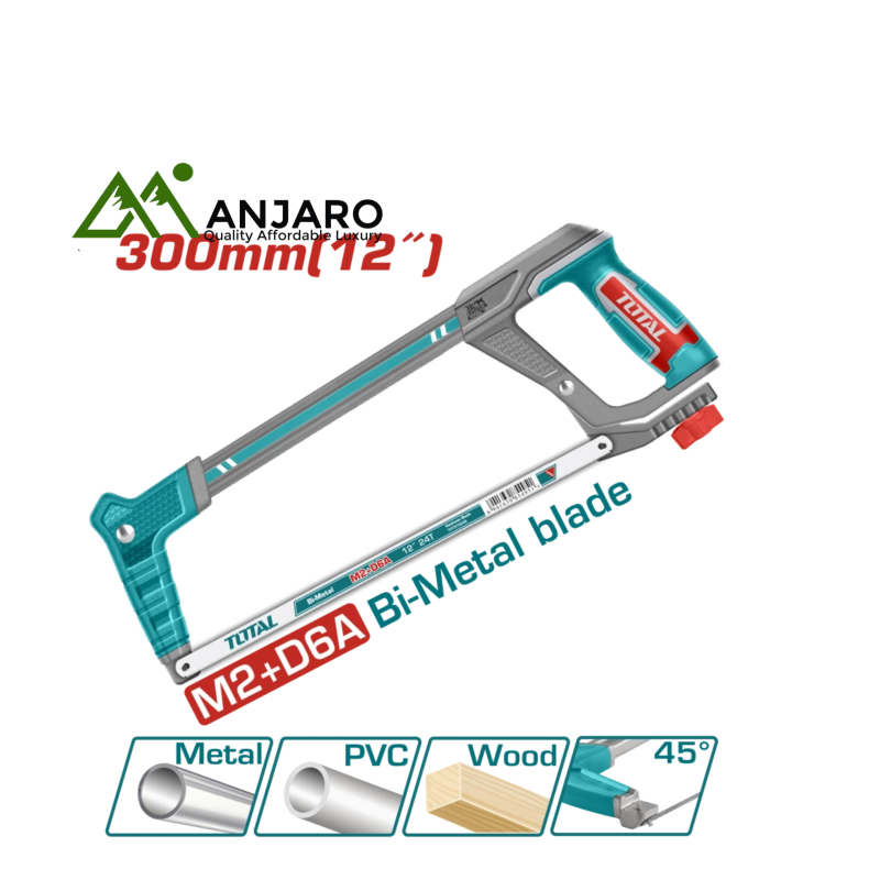 The Total THT541016 Hacksaw Frame is a practical tool for cutting a variety of materials including metal and plastic. It features a sturdy yet lightweight metal frame that accommodates standard 12-inch blades. Designed with an ergonomic handle, this hacksaw ensures a firm grip and ease of control, making it ideal for workshops, job sites, and home repairs. With its durable construction and precise tension adjustment, the THT541016 delivers clean and efficient cuts every time.