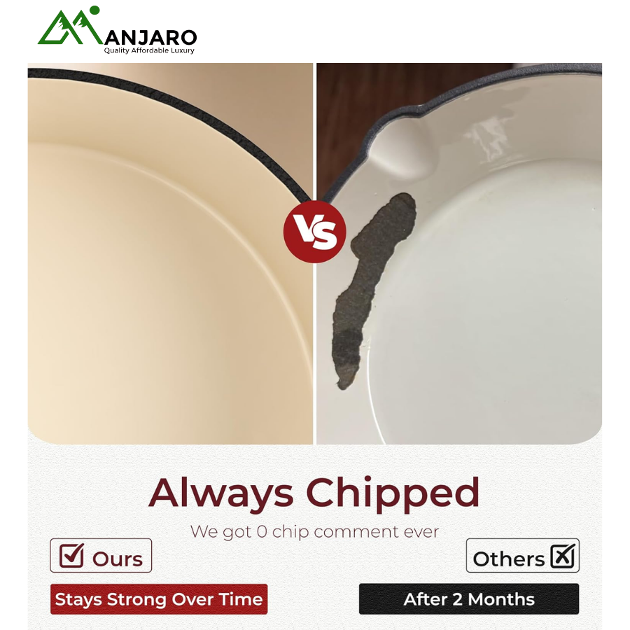 The set includes three essential cooking pieces: two deep round Dutch Ovens/Casseroles and one large Skillet/Frying Pan. The skillets and casseroles feature a contrasting white enameled interior for a naturally nonstick surface and easy monitoring of food. The heavy-duty construction is perfect for searing, slow cooking, baking, and serving. This professional-grade set empowers classic culinary self-discovery and supports the community’s pursuit of investment-quality kitchen tools with quality affordable luxury.