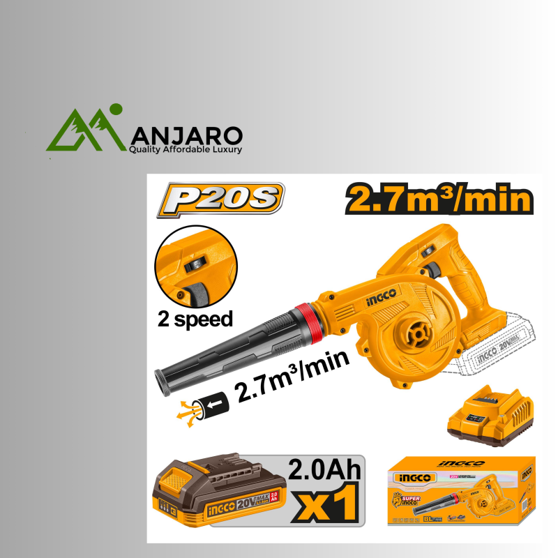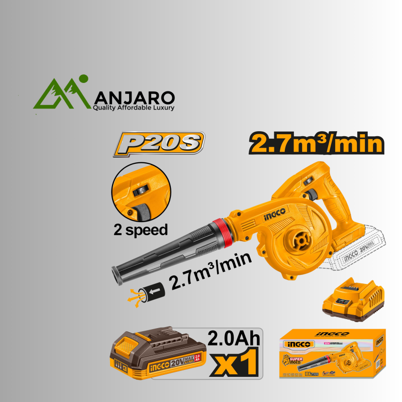 The CABLI20781 Cordless Blower delivers powerful air performance for quick and efficient cleaning of workspaces, garages, gardens, and equipment. Designed with a high-speed motor of 18000rpm and a maximum air volume of 2.7m³/min, this blower ensures strong and consistent airflow while remaining lightweight and portable.