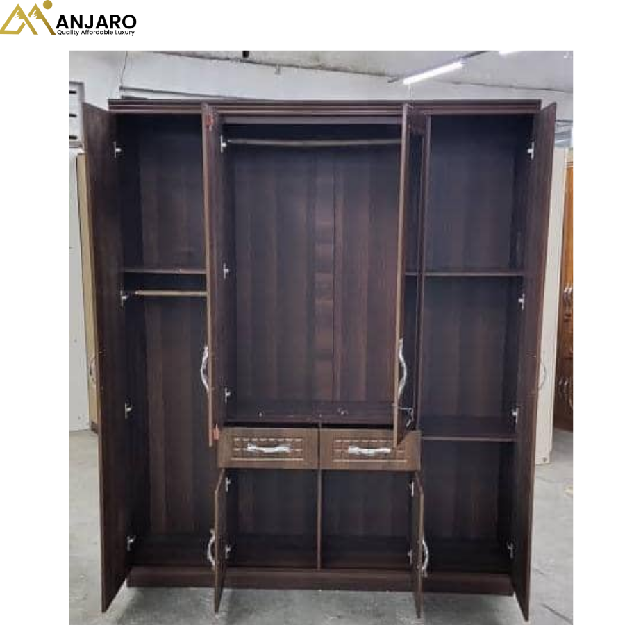 The Classic Walnut 4-Door Wardrobe is a premium furniture centerpiece designed for extensive organization and timeless style. This wardrobe features a rich, deep walnut wood-grain finish, offering a sophisticated look that complements both classic and contemporary Ghanaian interiors. The exterior is characterized by a mix of vertical slat textures and square-grid decorative paneling on the outer doors, providing a unique architectural feel. Two central doors are fitted with tall, rectangular mirrors, allowing for easy daily grooming while reflecting light to make your room feel more spacious.