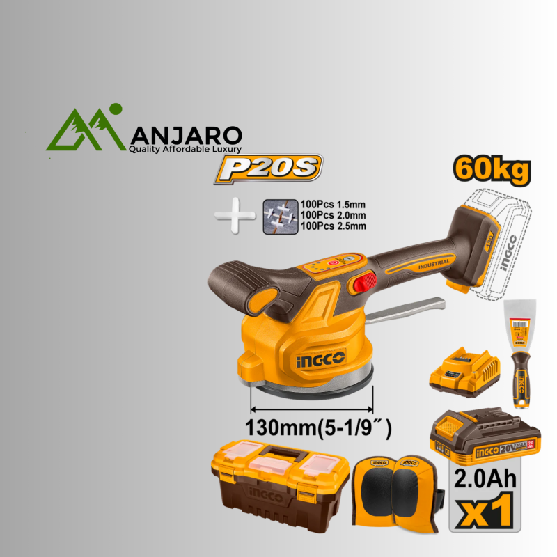 Its 130mm suction cup offers strong adsorbability up to 60kg, providing excellent grip on tiles of various sizes. The cordless 20V design gives you freedom of movement, while the included 2.0Ah battery and charger ensure consistent, long-lasting power. Complete with kneepads, putty trowel, and tile spacers (1.5mm, 2.0mm, 2.5mm), this set has everything you need for professional-quality tile installation.