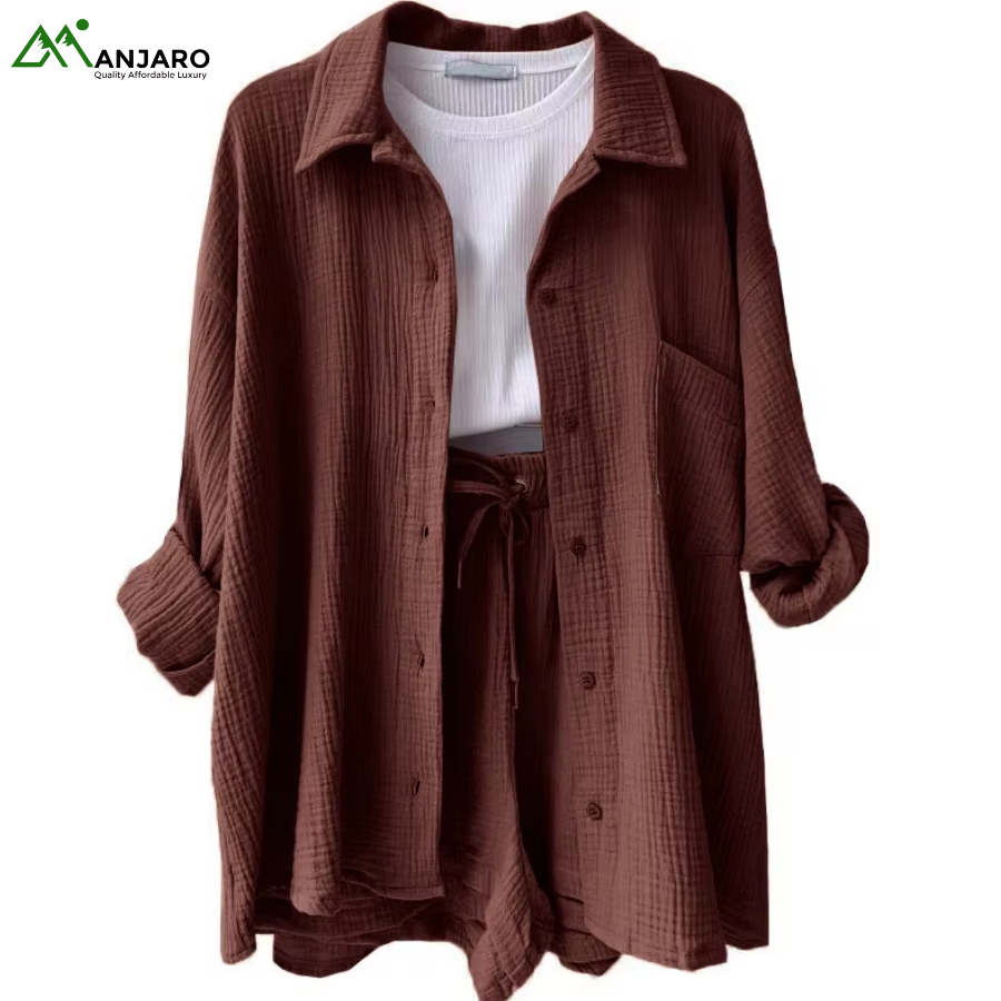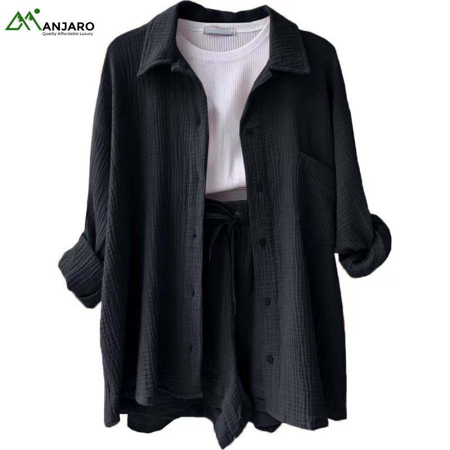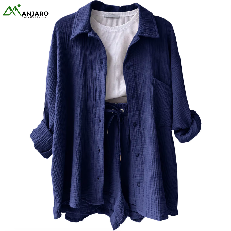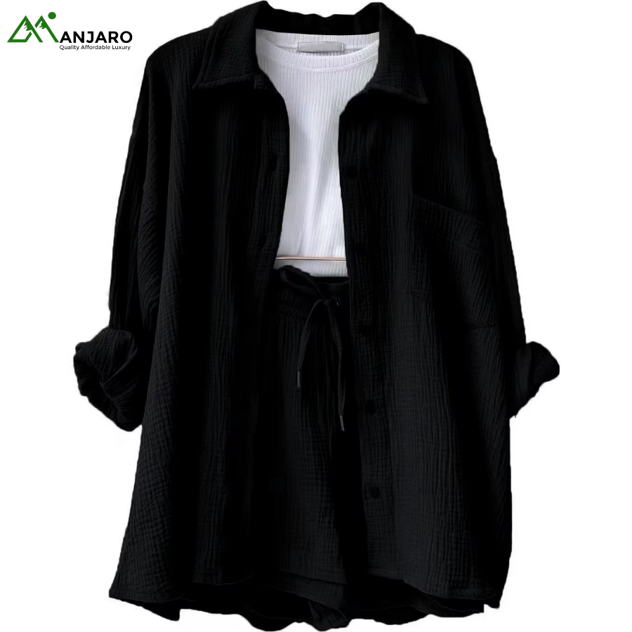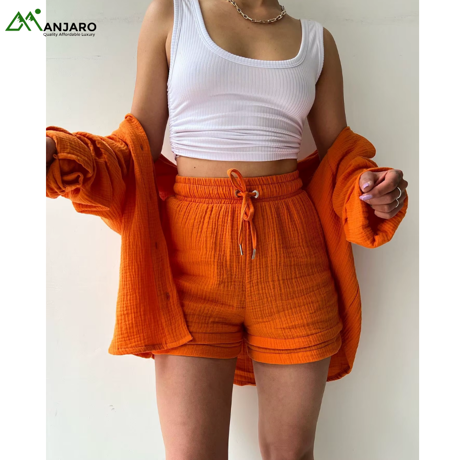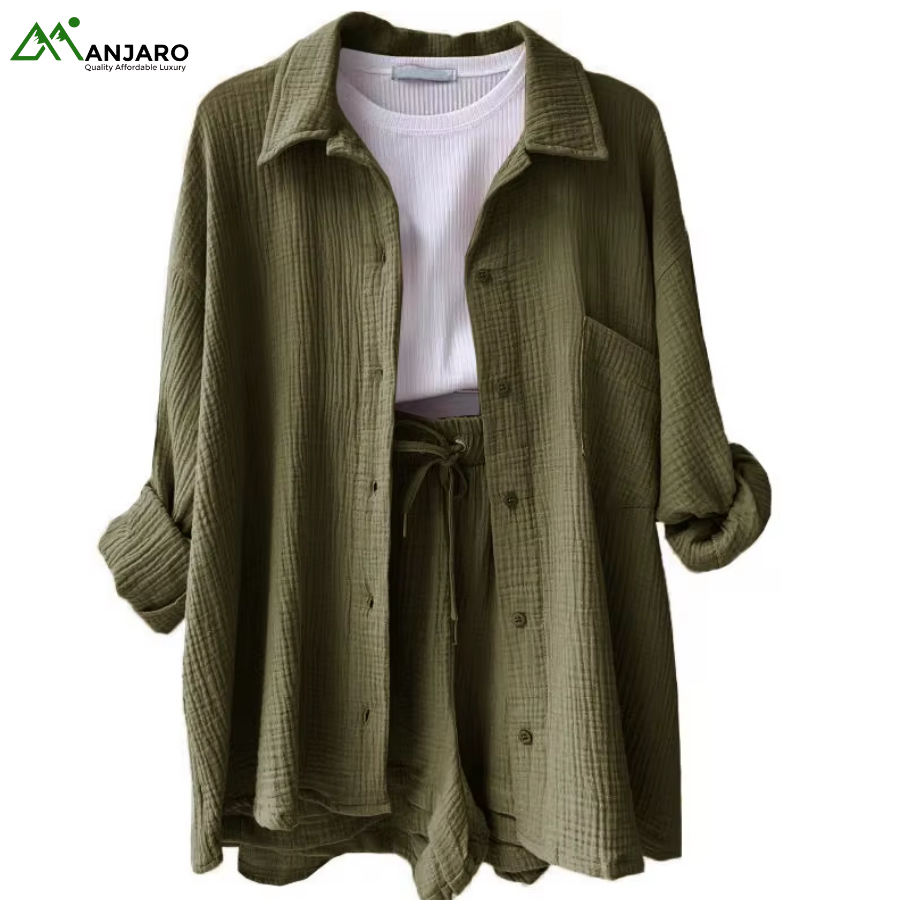 Crafted from a premium 65% cotton and 35% polyester knitted fabric, the set is breathable, eco-friendly, and quick-drying, ensuring you stay comfortable and stylish all day long. The shorts feature a high-waisted design with a drawstring for a customizable fit, while the shirt provides a relaxed yet polished look, ideal for casual outings, brunches, or summer vacation wear. With functional pockets and garment-dyed detailing, this set is both practical and effortlessly trendy.