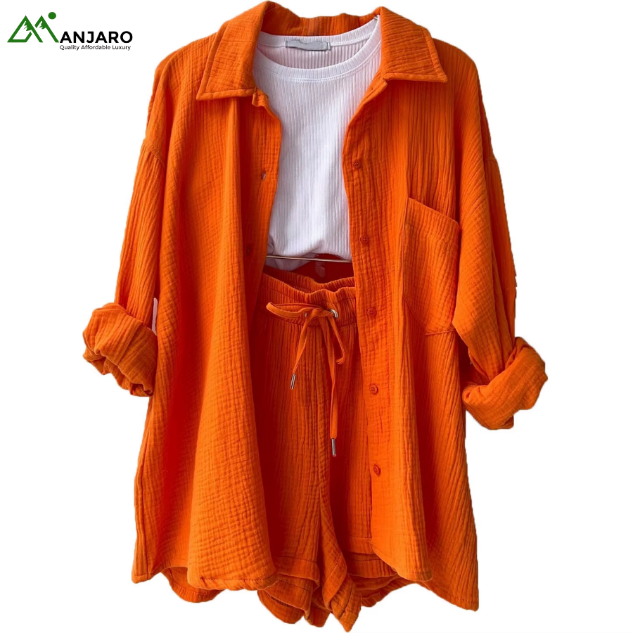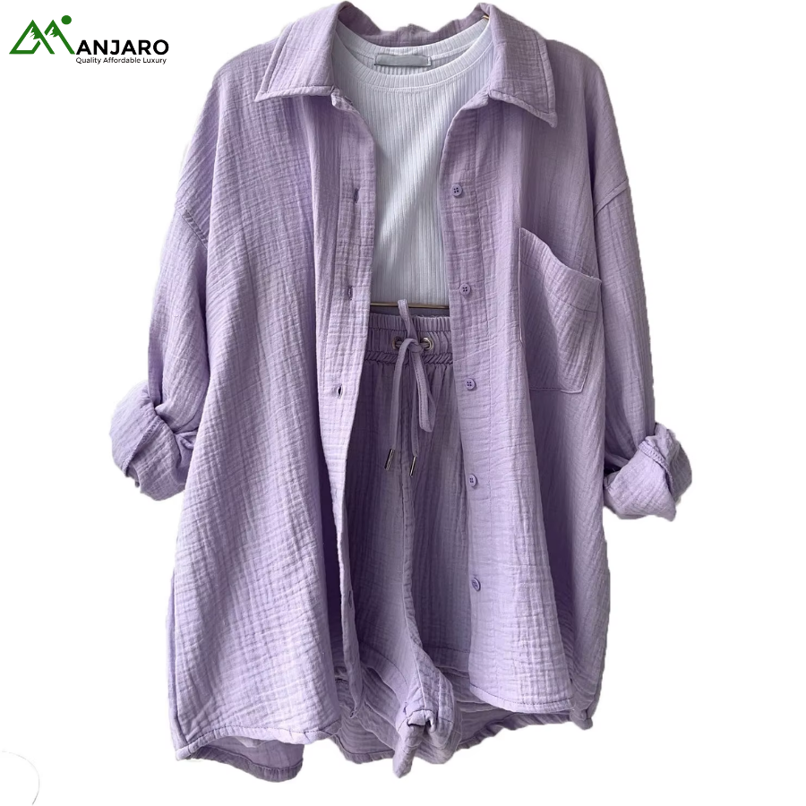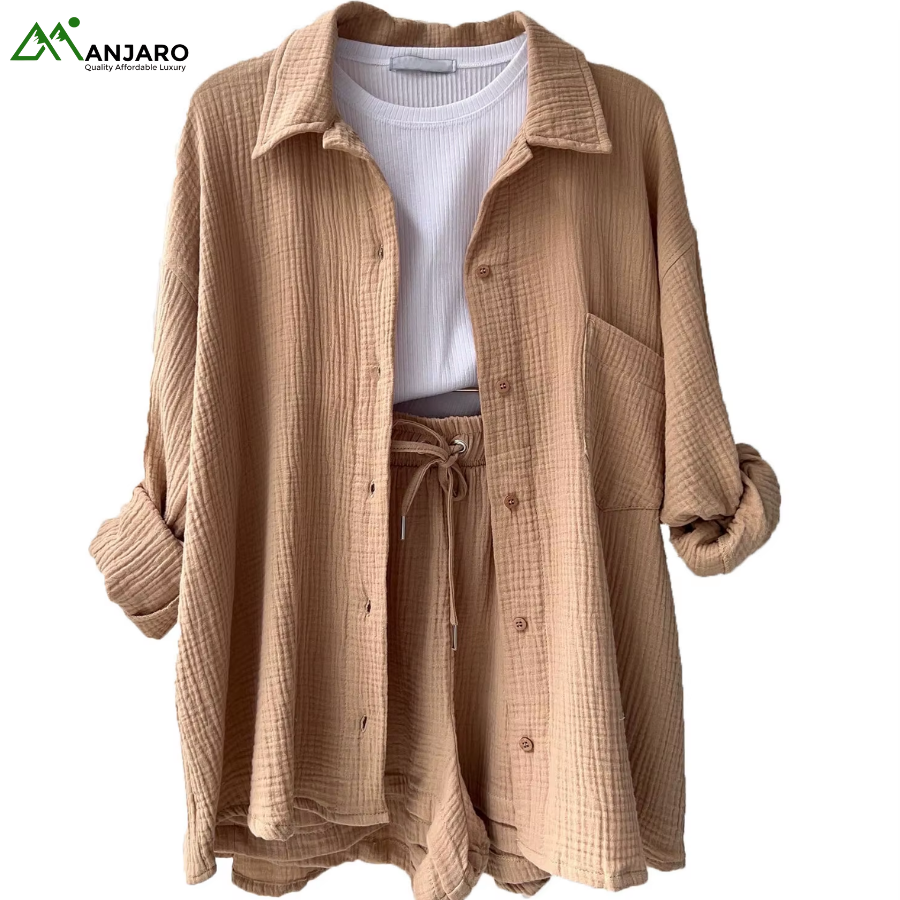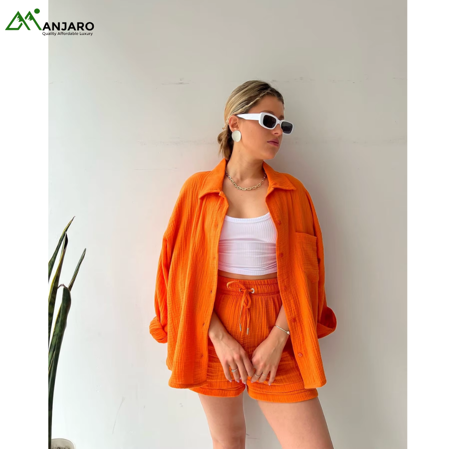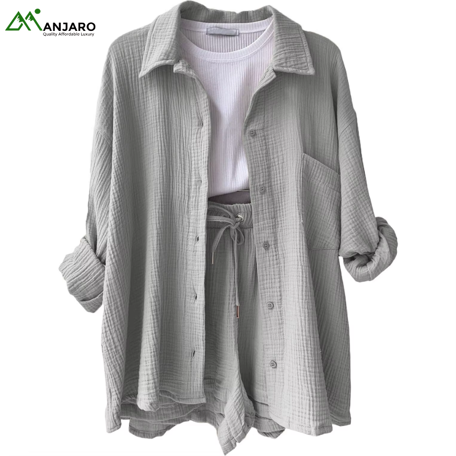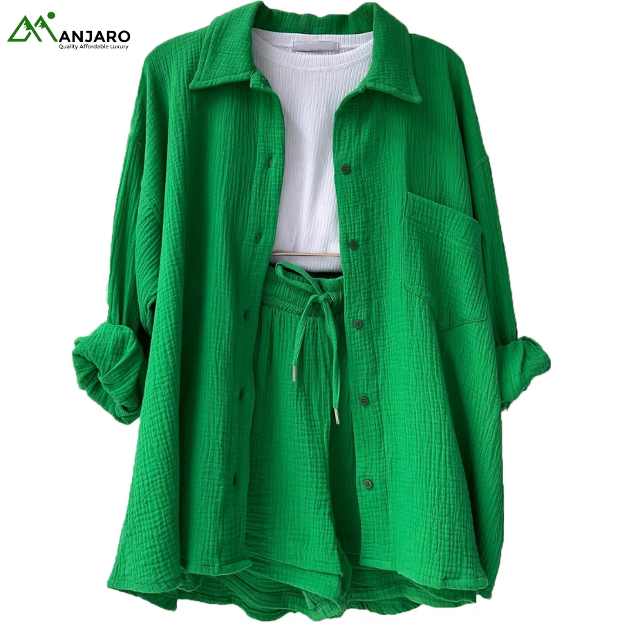 Crafted from a premium 65% cotton and 35% polyester knitted fabric, the set is breathable, eco-friendly, and quick-drying, ensuring you stay comfortable and stylish all day long. The shorts feature a high-waisted design with a drawstring for a customizable fit, while the shirt provides a relaxed yet polished look, ideal for casual outings, brunches, or summer vacation wear. With functional pockets and garment-dyed detailing, this set is both practical and effortlessly trendy.