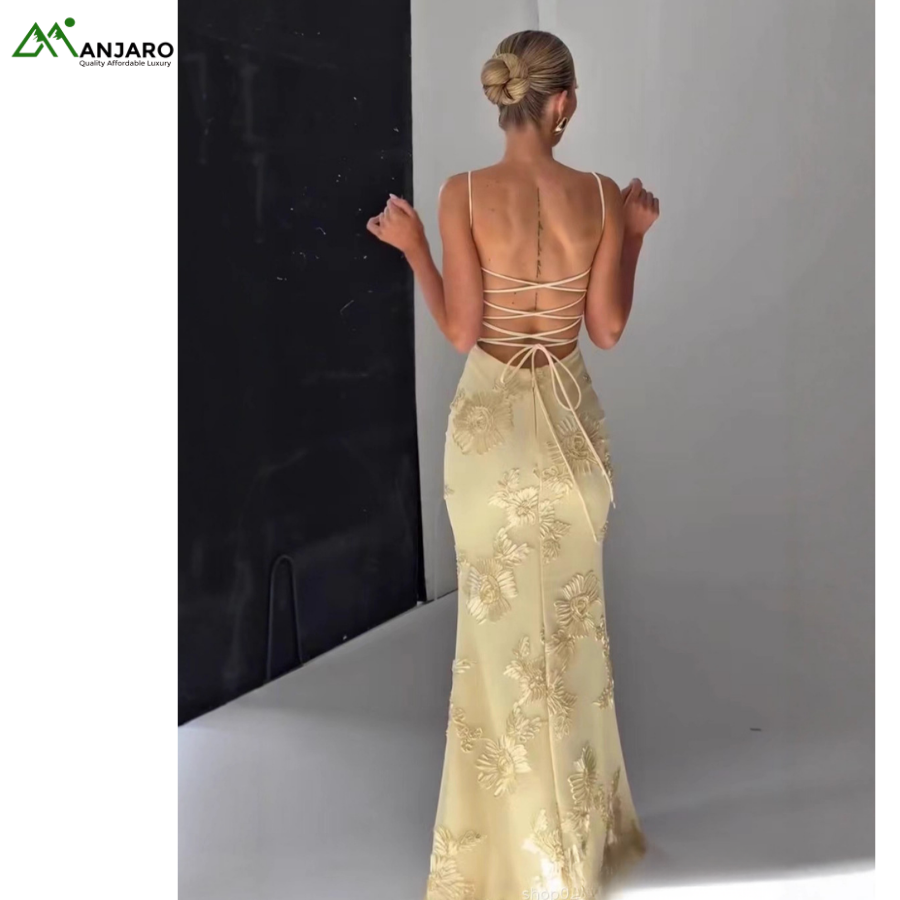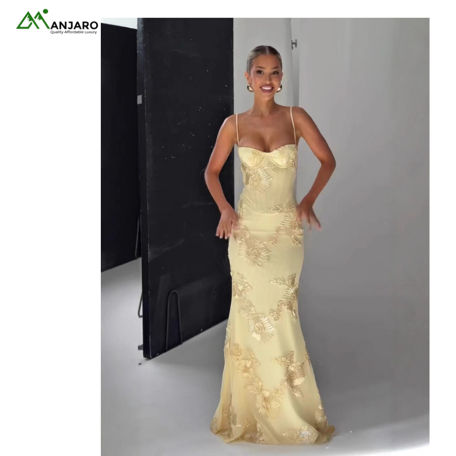 Crafted from high-quality polyester, this resort gown showcases intricate 3D floral embroidery and delicate lace detailing, creating a romantic, couture-inspired look. The strapless suspender silhouette and fishtail hemline gracefully highlight your curves, making it perfect for high-end soirées, resort events, and evening galas.