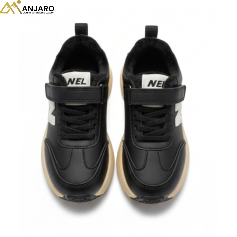 Step into superior comfort and classic street style with these robust black thermal sneakers, designed for the active child. These shoes feature a sleek, matte black synthetic upper accented by a bold, contrasting white "N" logo on the side for a high-end athletic aesthetic. The interior is fully lined with thick, plush black faux fur, providing essential thermal protection and a soft, cozy environment for small feet during cooler weather. Engineered with a durable cream-colored midsole and a high-grip black outsole, these sneakers offer the perfect balance of shock absorption and stability. Positioned as Quality Affordable Luxury, this versatile footwear is a must-have for parents who value durability and a fresh, forward-thinking look for school or weekend adventures.