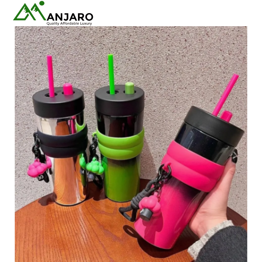 Featuring a sleek, mirror-finish silver body and a vibrant neon green gradient accent (or solid silver), each mug includes a secure lid and a practical silicone carry strap with a fun, decorative charm. They are essential for promoting healthy hydration and reducing reliance on single-use plastics. These mugs empower efficiency and contribute to the community's wellness by making it easier to stay energized on the go.