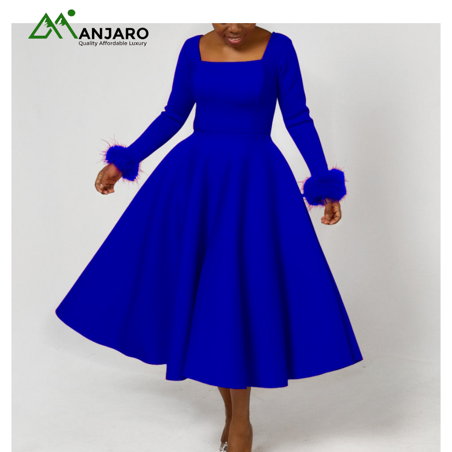 Step into luxury this season with the Elegant Fur-Trimmed Full Skirt Party Dress, a stunning fusion of African-inspired elegance and timeless glamour. Crafted from premium polyester-spandex blend, this dress balances comfort, stretch, and structure — giving you a sculpted silhouette without sacrificing freedom of movement.