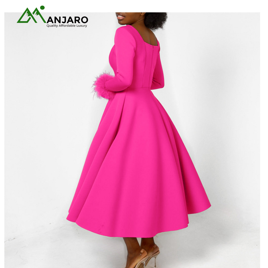 The square neckline and fitted bodice flow gracefully into a full, flared skirt, enhanced with subtle fur trimming that adds a touch of winter opulence. The long sleeves and high waistline flatter your figure while offering warmth and refinement for cooler months.