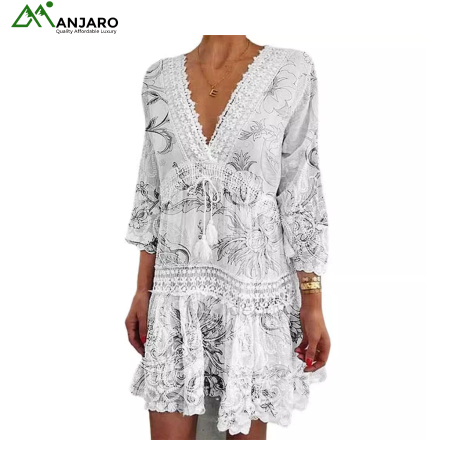 Made from soft, breathable polyester and spandex blend, this dress delivers comfort and flexibility that moves with you. Its hollow-out detailing and three-quarter sleeves add a flirtatious yet refined touch, while the high-waisted silhouette flatters your shape beautifully. The V-neckline enhances your natural neckline, and the flowing midi length makes it perfect for sunny getaways, brunches, or casual evenings out.