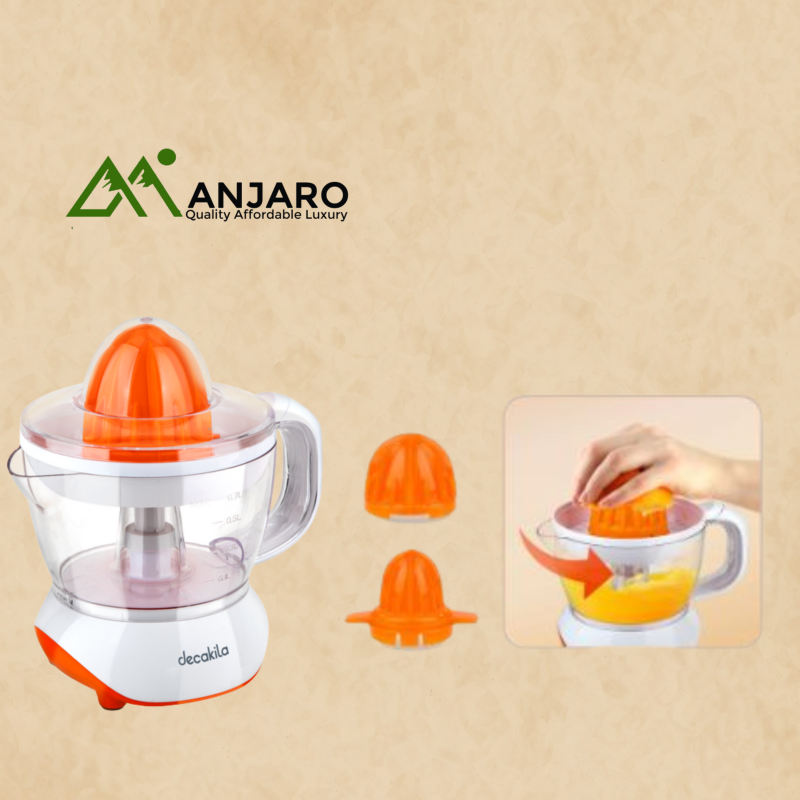 The Decakila KEJC007W Citrus Juicer is your go-to appliance for fresh, homemade citrus juice in seconds. Equipped with dual rotating cones and a powerful motor, it effortlessly extracts juice from oranges, lemons, limes, and more. The 1-litre transparent jug collects ample juice for your family’s needs, while the anti-drip spout and easy-pour design ensure a mess-free experience. With its compact footprint, detachable parts, and simple cleanup, this juicer makes healthy living quick and convenient.