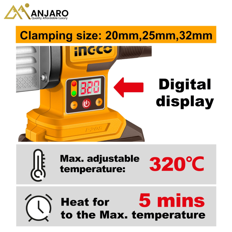 The INGCO PTWTLI2018 Cordless Plastic Tube Welding Tool is a versatile 20V tool designed for quick, clean, and reliable welding of plastic pipes. Capable of handling clamping sizes of 20mm, 25mm, and 32mm, it is ideal for plumbing, heating, and DIY piping projects. The tool reaches a rated temperature of 0–320℃, ensuring uniform heating and strong, leak-free welds every time.