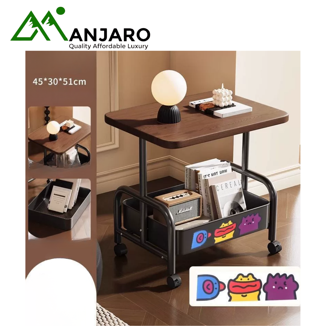 With upgraded swivel wheels, the table glides smoothly across any surface, making it easy to reposition beside your sofa, bed, or reading chair. Its compact yet spacious structure includes storage space, allowing you to organize essentials like books, remotes, cups, or decorative pieces.