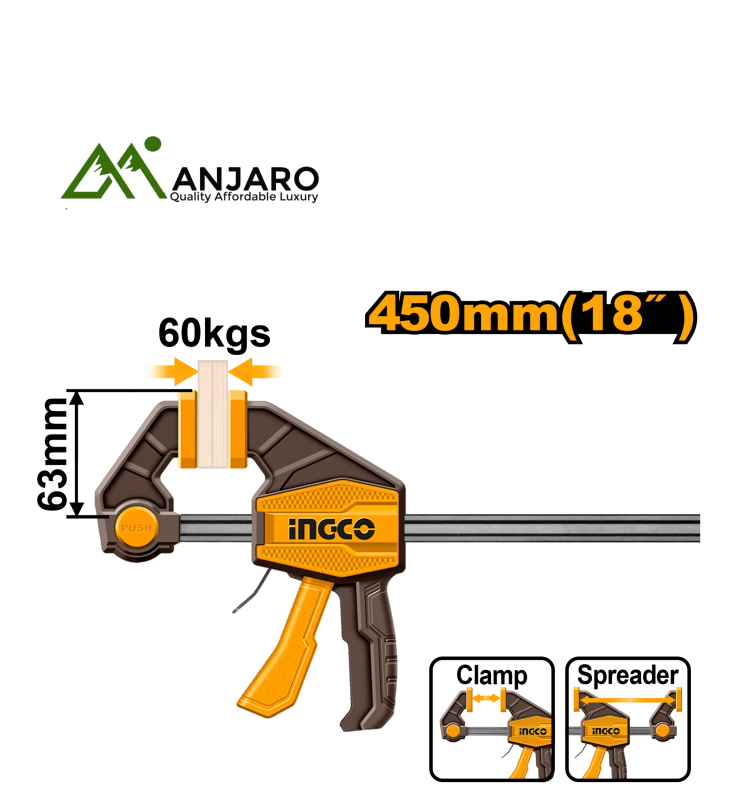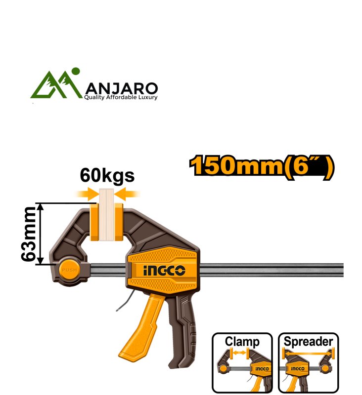 The Ingco Quick Bar Clamp series—HQBC01603, HQBC01602, and HQBC01601—is designed for fast, one-handed clamping during woodworking, metalworking, and DIY assembly projects. These clamps feature a robust steel bar, quick-release trigger, and a reinforced nylon body to deliver high clamping force with smooth operation. Whether you're holding pieces in place for gluing or cutting, these versatile clamps offer firm grip and consistent pressure without damaging materials. Ideal for both home workshops and professional job sites.