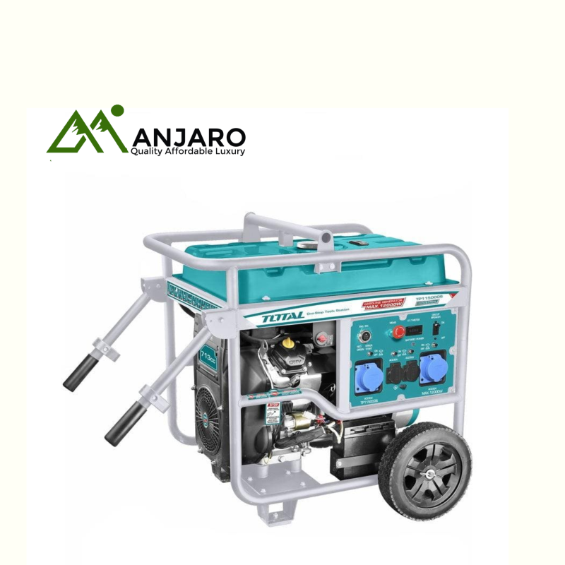 Power through any outage or jobsite challenge with the Total 12 kW Gasoline Generator TP1150006. Driven by a robust V‑Twin 21 HP, 713 cc engine, this powerhouse delivers up to 12 kW peak (11 kW continuous) of stable electricity — ideal for heavy-duty tools, home backup systems, or event power. Equipped with electric and recoil starts, voltage-regulated output, and a large 40 L fuel tank, this generator ensures reliable performance for up to 9 hours at full load. Mounted on a rugged steel frame with wheels and auxiliary handles, it balances portability and strength. A durable copper-coil alternator, TCI ignition, and noise level around 76 dB make this an efficient and dependable choice for residential and professional use.