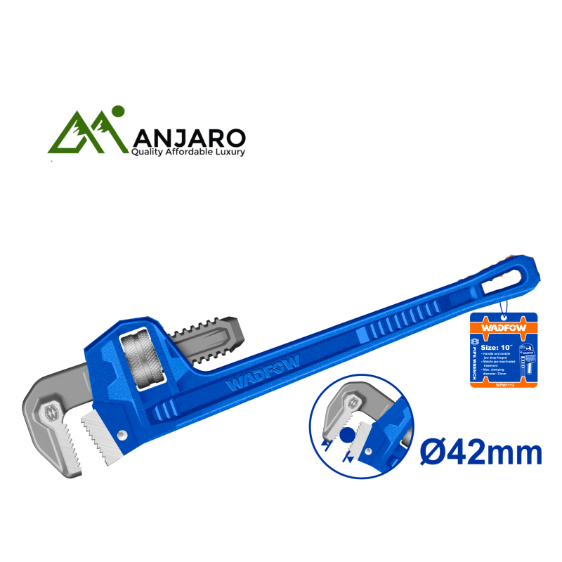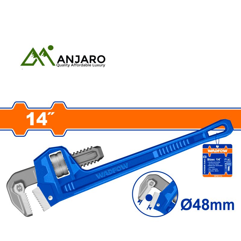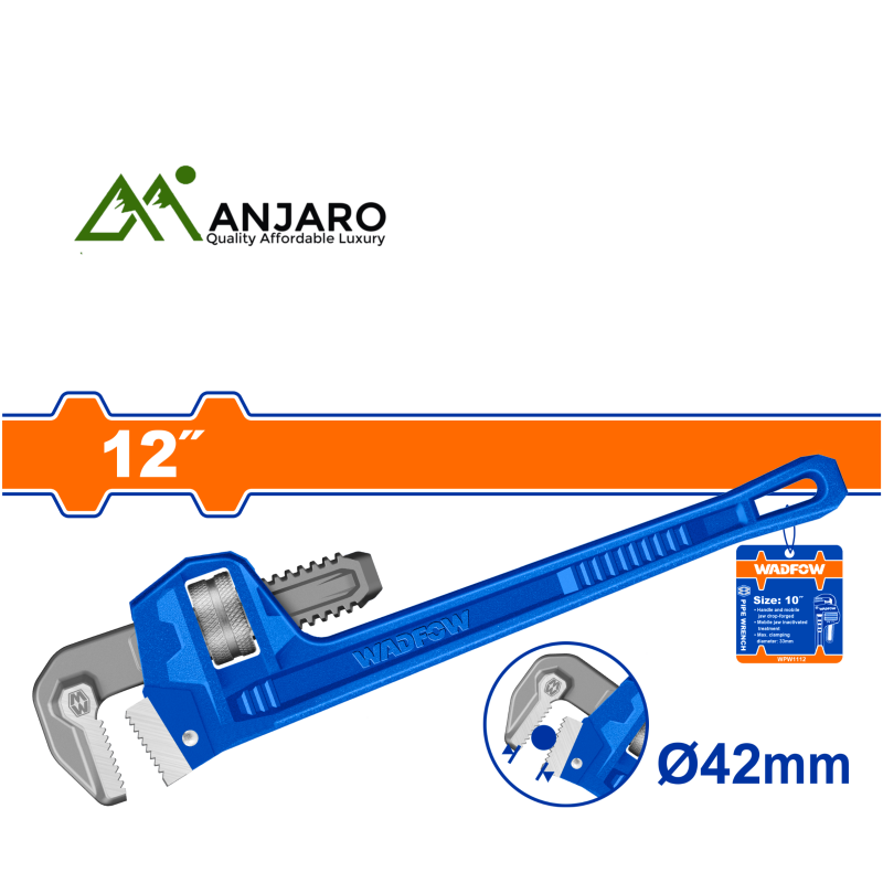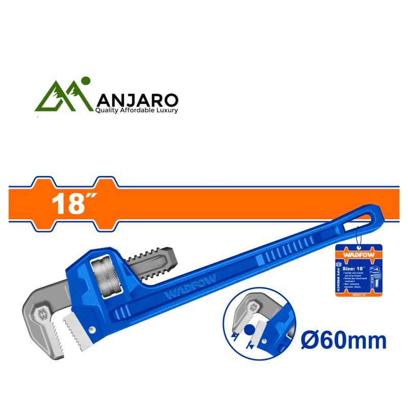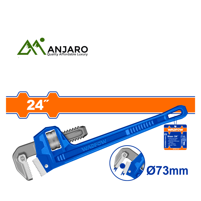 The Wadfow Heavy-Duty Pipe Wrench series delivers industrial-grade strength and gripping power for demanding plumbing and mechanical tasks. Available in five sizes—10", 12", 14", 18", and 24"—these wrenches are constructed from drop-forged steel for maximum durability and corrosion resistance. Their precision-machined jaws provide a secure grip on pipes, fittings, and rounded surfaces, while the adjustable nut ensures easy jaw opening. Designed with a textured, anti-slip handle for comfort and control, these pipe wrenches are essential for professionals and DIYers who demand performance and reliability.