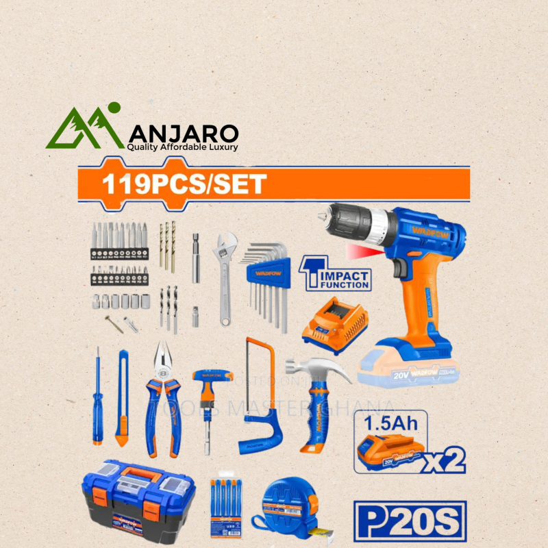 The Wadfow WDT1B119 119 Pcs Tools Set is a comprehensive toolkit designed for both professional tradespeople and home users who demand performance, versatility, and reliability. At its core is the 20V cordless impact drill (model WCDP522) delivering adjustable speeds, high torque, and a powerful impact rate for drilling and fastening tasks. This set includes two rechargeable battery packs, a fast charger, and a wide range of accessories—perfect for construction, assembly, repairs, and DIY projects. Packed in a sturdy case, it ensures organized storage and easy transport to any job site.