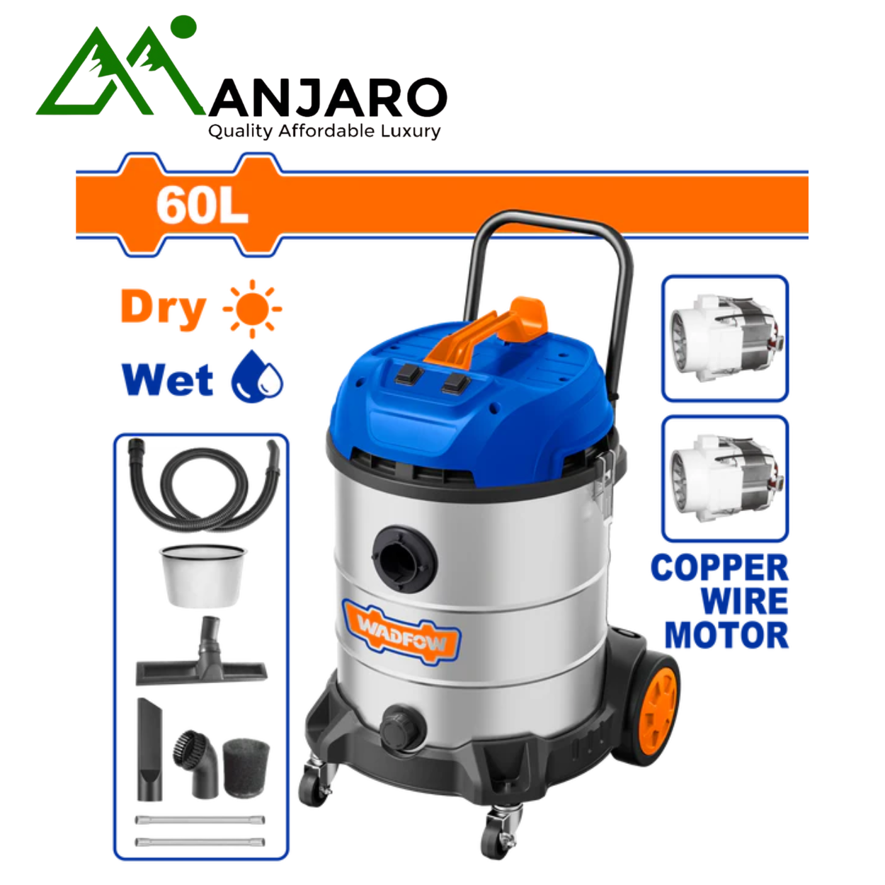 Featuring high-performance motors from 1000W to 3×1200W and advanced airflow management, each model ensures effective dust, dirt, and liquid removal. The WVR6520 features a HEPA filter, automatic cable rewinder, and soft start for convenient home use. Larger models like the WVR5A60 and WVR5A90 include stainless steel tanks, wet and dry cleaning capabilities, flexible hoses, metal extension tubes, and high-capacity dust tanks (60L–90L) for industrial or commercial cleaning tasks.