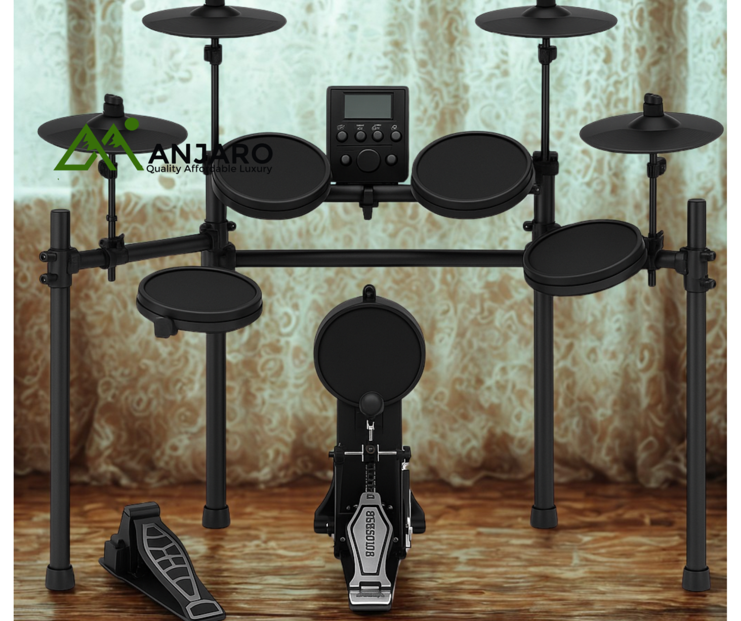 Engineered with 10 reverb effects and a built-in metronome (30–300 BPM), it includes a double-trigger snare with side strike capability, and connected drum design for consistent performance. The alloy footboard pedals offer durability and a natural feel, while output and headphone jacks ensure flexible monitoring and silent practice.