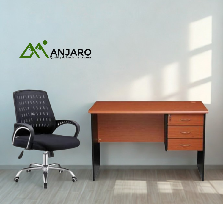 The desk features a sturdy wooden surface with a rich walnut finish and three spacious drawers for storing office essentials, keeping your workspace neat and organized. Paired with a breathable mesh-back ergonomic chair, this set is built to support long hours of focused work. The chair’s smooth swivel base, height adjustment, and padded seat ensure day-long comfort and posture support.