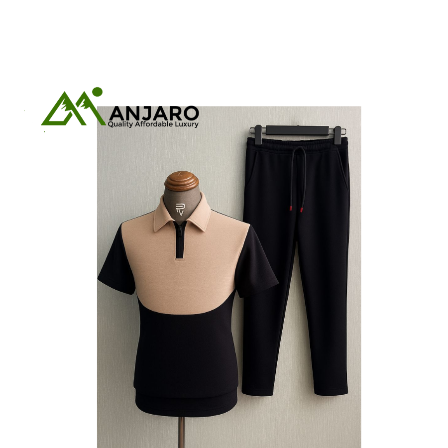 Make a statement with this Contrast-Yoke Polo Set, designed with a bold block yoke panel across the chest that adds a sharp and modern edge. The polo top features a sleek half-zip neckline, short sleeves, and a tailored fit, paired with matching slim-fit pants for a complete, polished look.