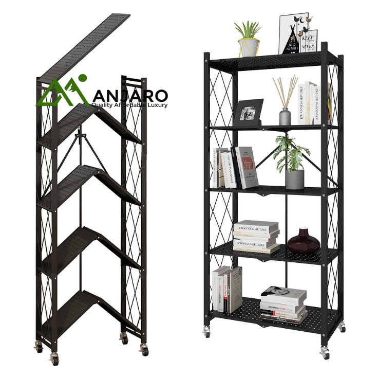 Maximize your storage space with the 5-Tier Foldable Metal Shelf Storage Rack in sleek black. Designed for both utility and style, this rack provides strong, stable shelving that folds flat when not in use—making it perfect for small spaces, minimalist homes, or mobile setups.