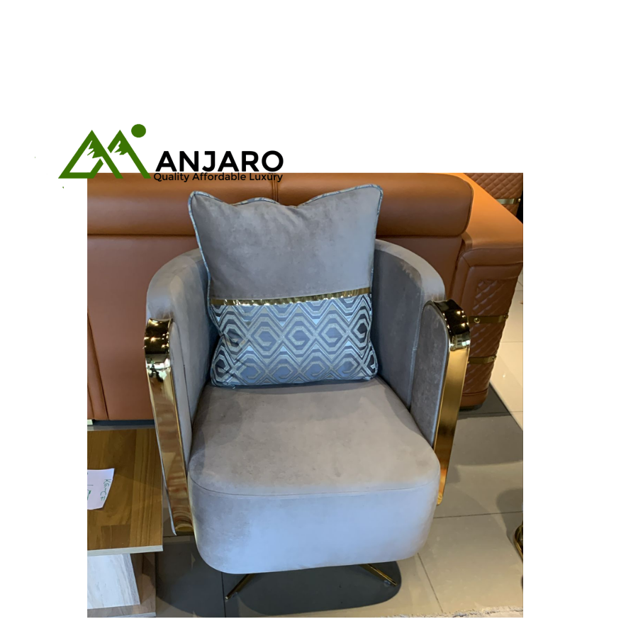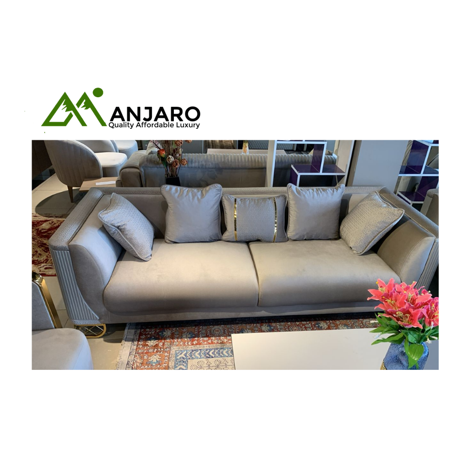 Transform your living space into a sanctuary of modern opulence with the Aura Prestige 7-Seater Sofa Set. This exquisite collection is meticulously designed for those with a discerning eye for forward-thinking luxury. Upholstered in a sophisticated two-tone combination of plush, soft grey/taupe velvet and a contrasting textured fabric, this set exudes elegance. The most captivating features are the brilliant polished gold metallic legs and trim, which frame the unique sculpted side panels, creating a breathtaking visual statement. With its deep, comfortable seating and an abundance of plush throw pillows, the Aura Prestige set is more than just furniture—it's an empowered centerpiece for building community, hosting guests, and indulging in unparalleled comfort and style.