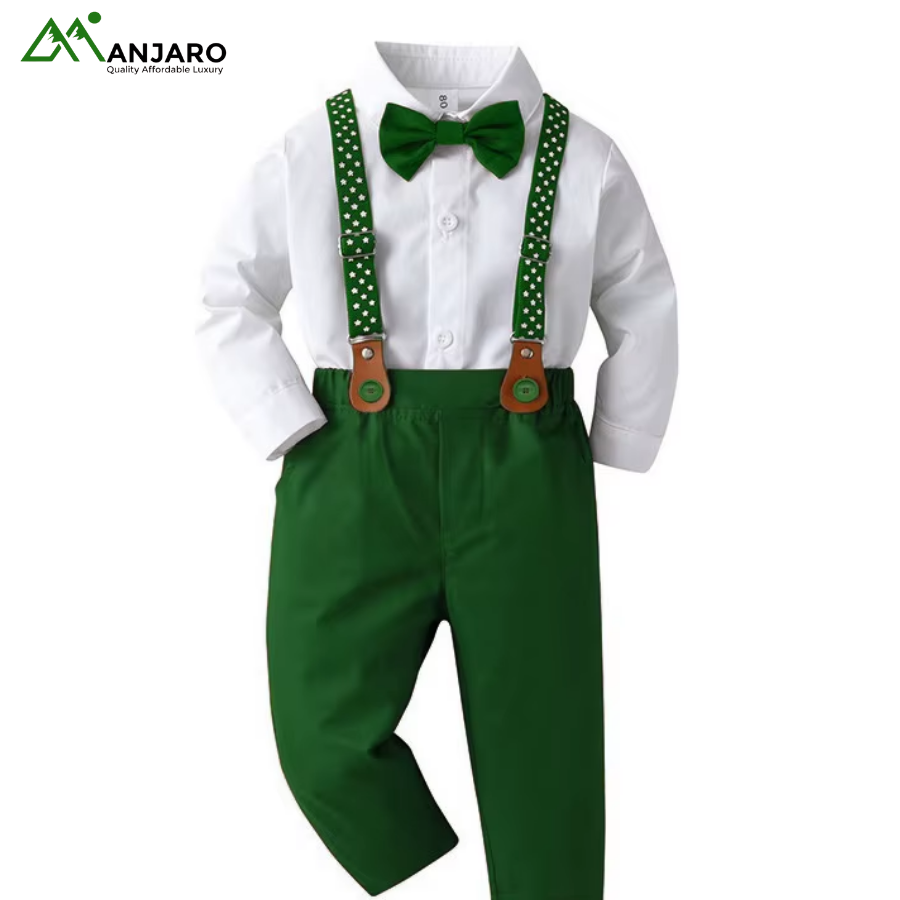Crafted from a soft cotton-polyester blend, this set is comfortable, breathable, and perfect for spring or autumn occasions. The lapel collar and button details add a sophisticated touch, while the suspenders ensure a secure, adjustable fit. Ideal for birthdays, weddings, family gatherings, or formal events, this ensemble combines practicality, comfort, and timeless style for young boys.